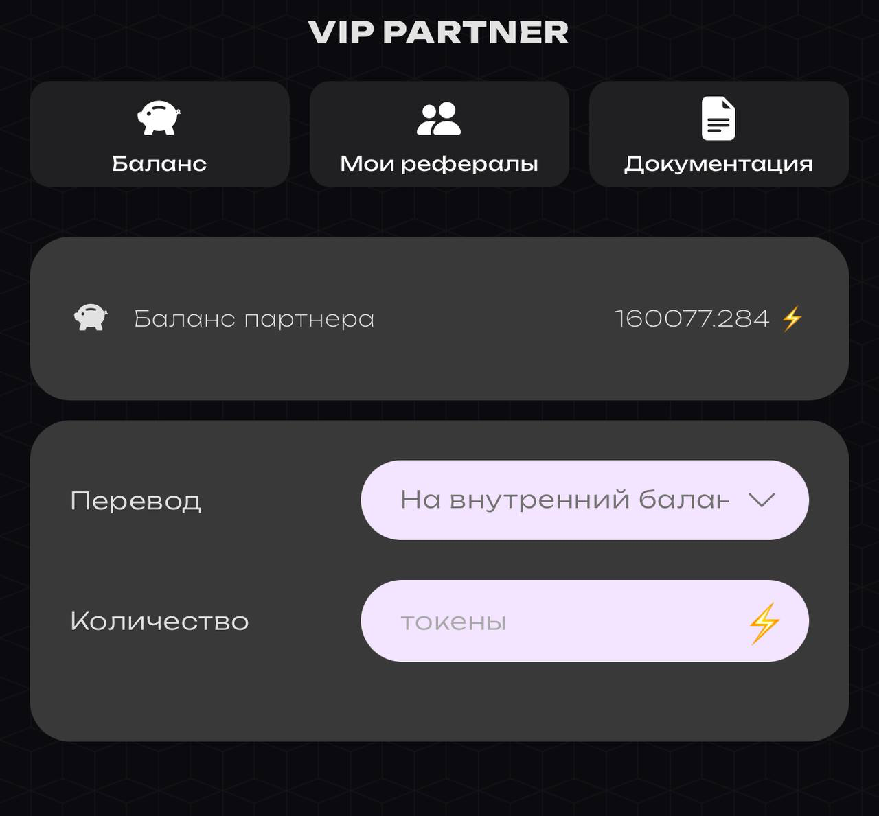 Вы можете перевести партнерские токены на внутренний баланс для их последующего использования в чат-бот. Для этого необходимо выполнить следующие действия: