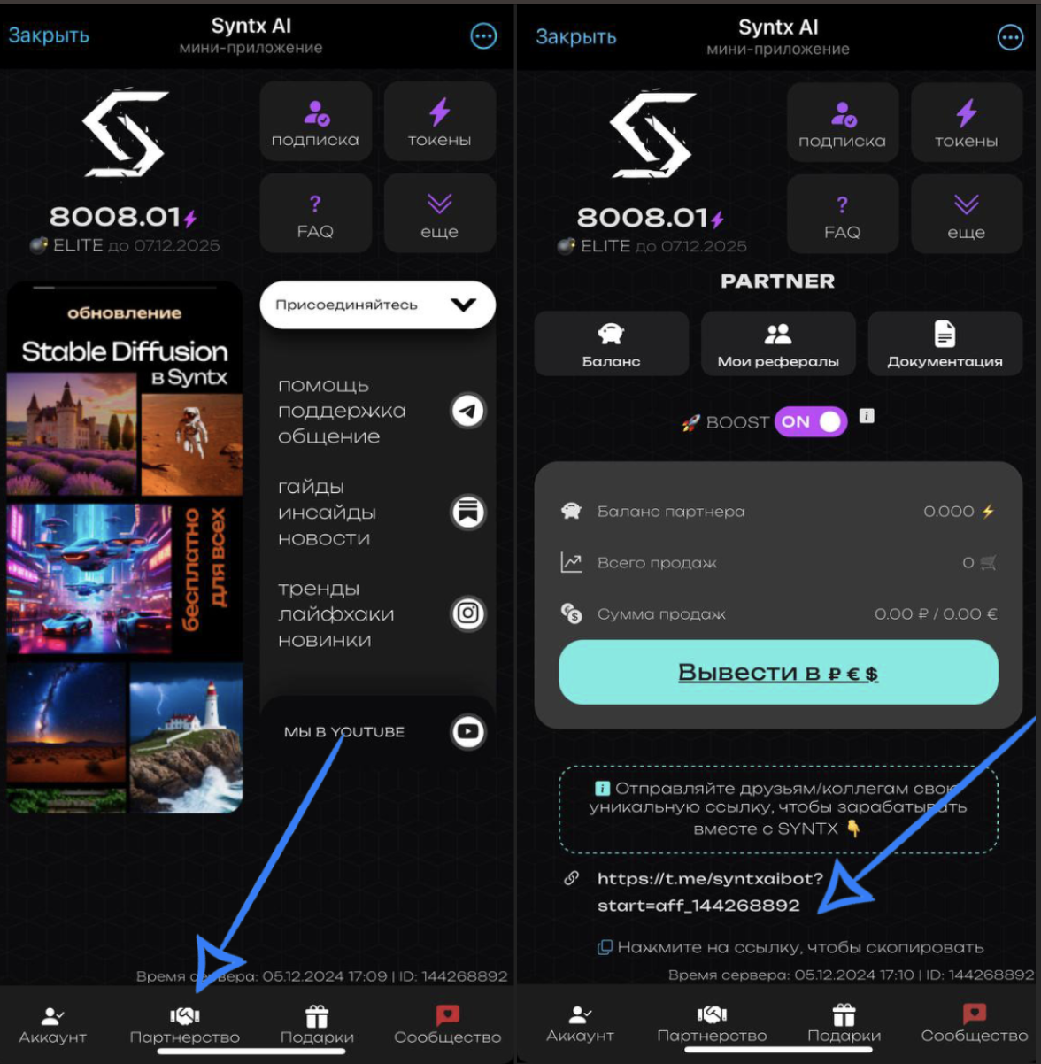В настоящее время для покупки подписки за партнерские токены необходимо обратиться в службу поддержки @SyntxHelp. Для этого вам потребуется предоставить следующие данные: