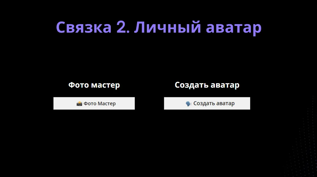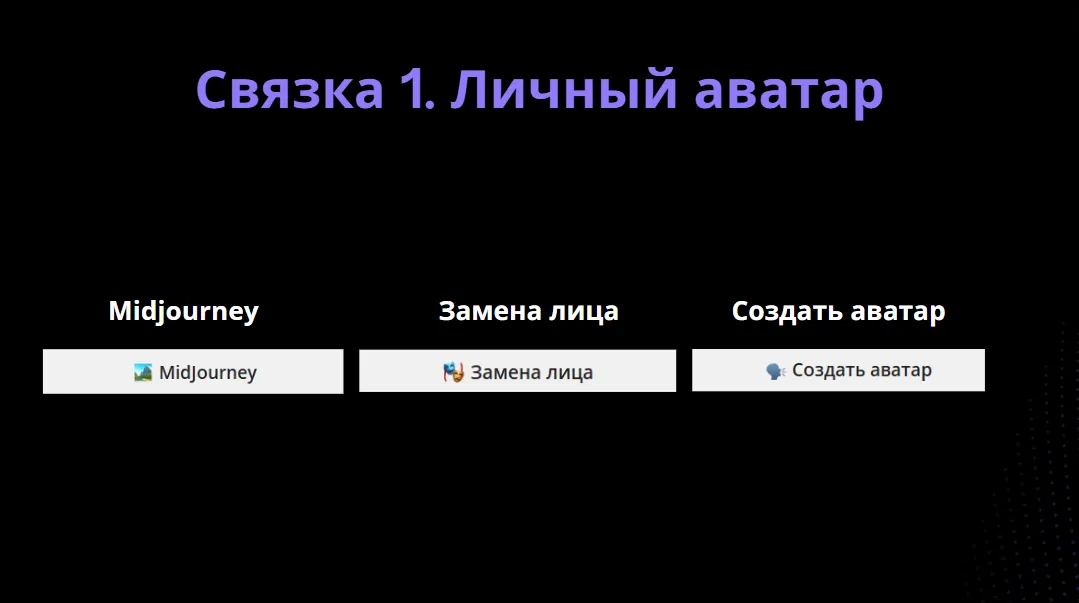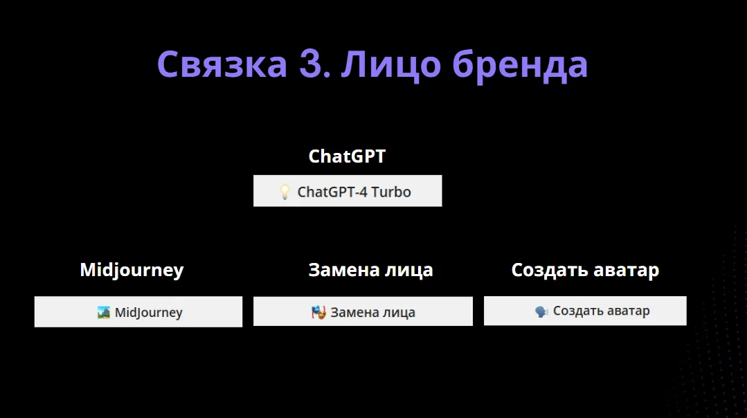 С помощью ChatGPT придумываем персонажа, который будет олицетворять наш бизнес. Генерируем его в Midjourney и при необходимости накладываем другое лицо через замену лица. Используем полученное изображение для создания аватара по инструкции с видеозаписи мастер-класса.