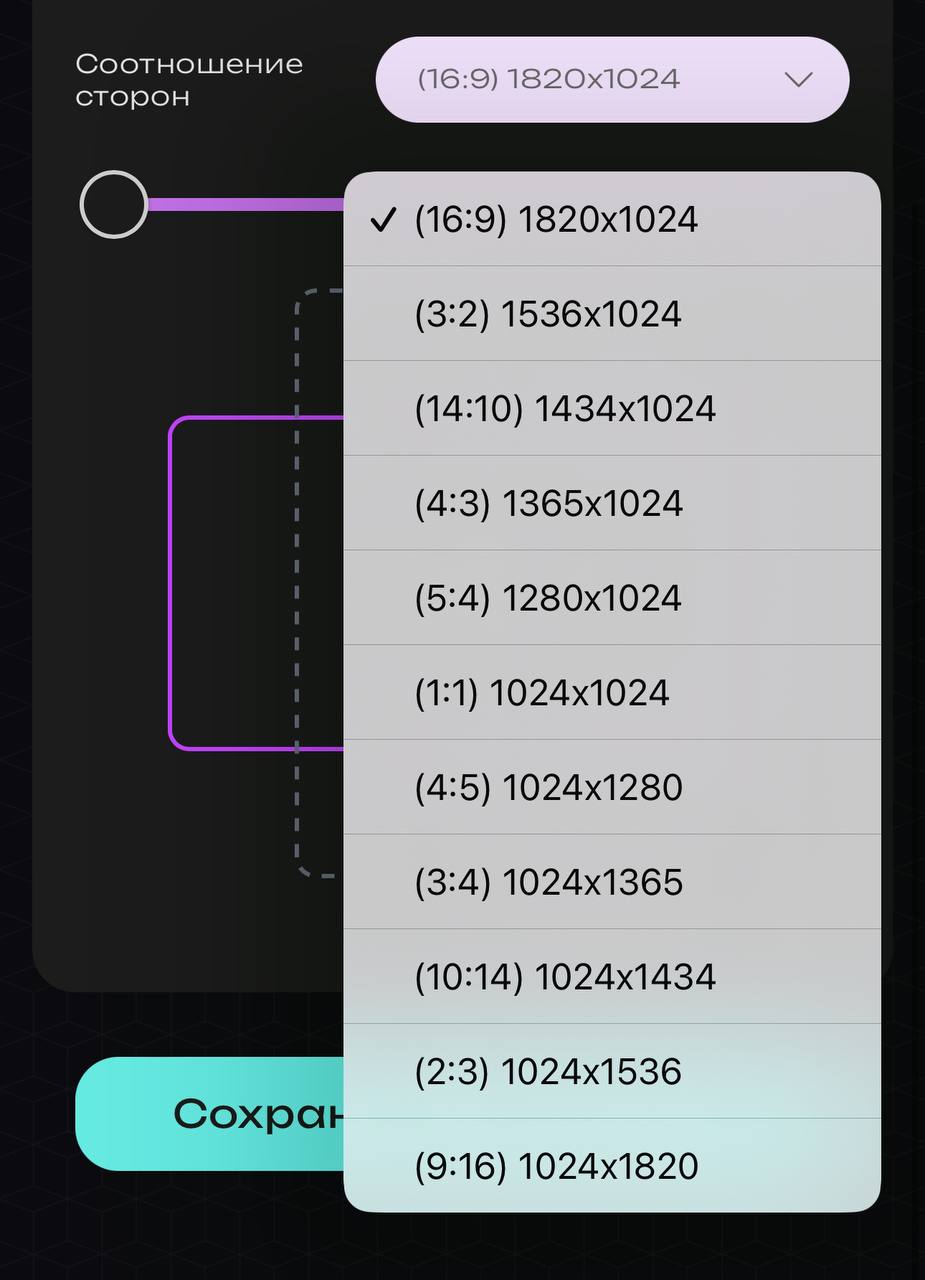 На выбор вам доступно 11 форматов изображения. По умолчанию стоит 1:1.