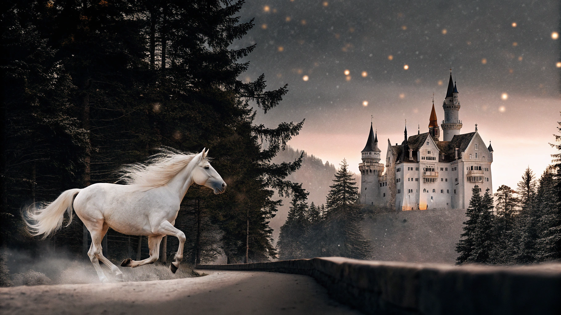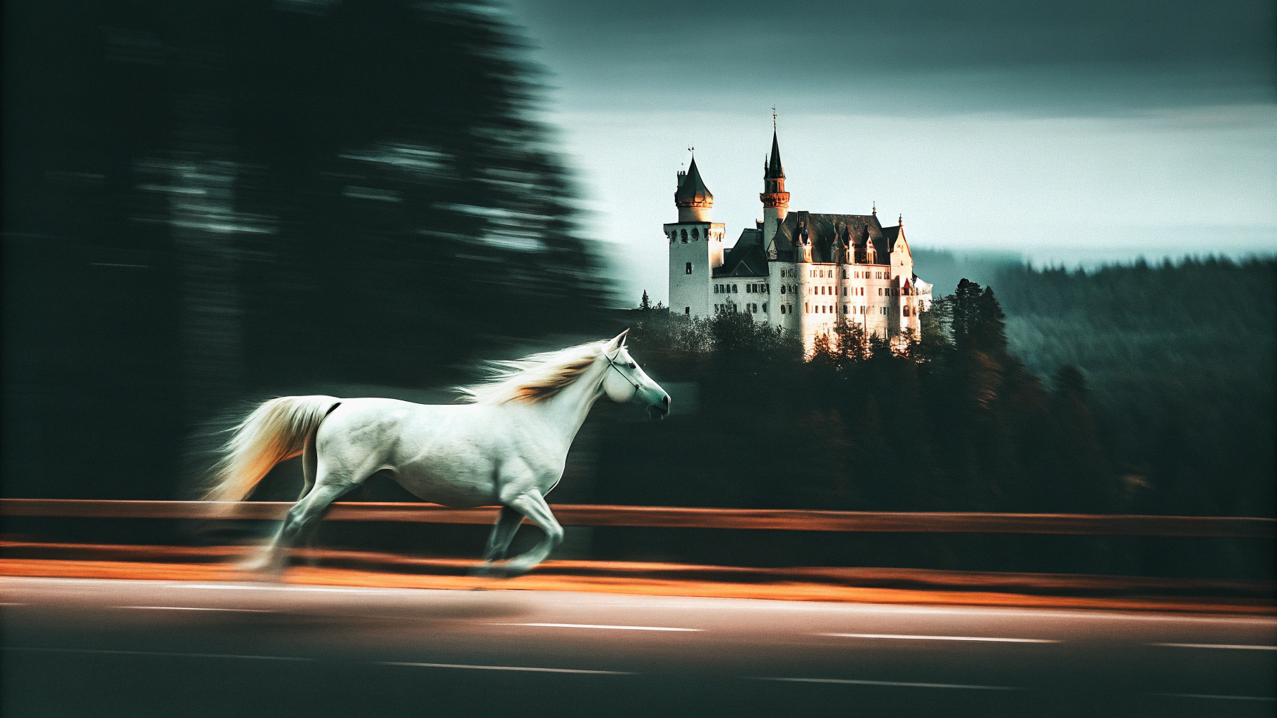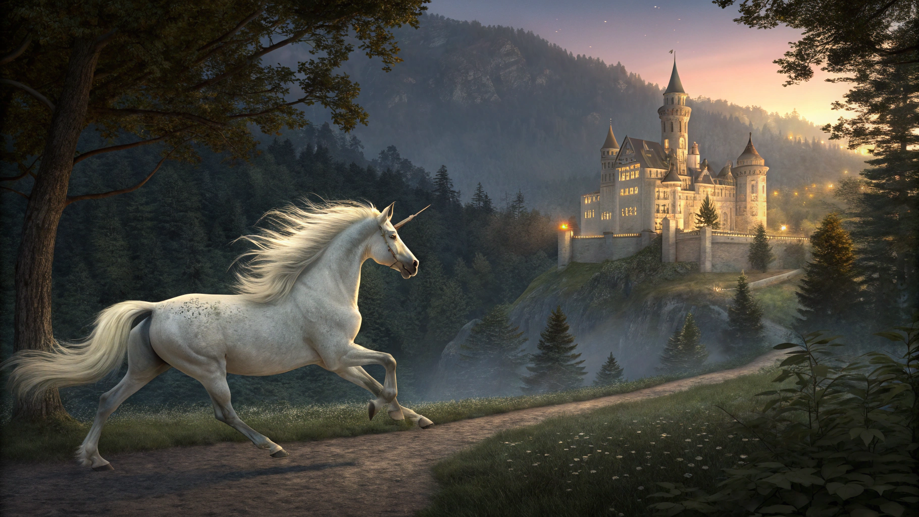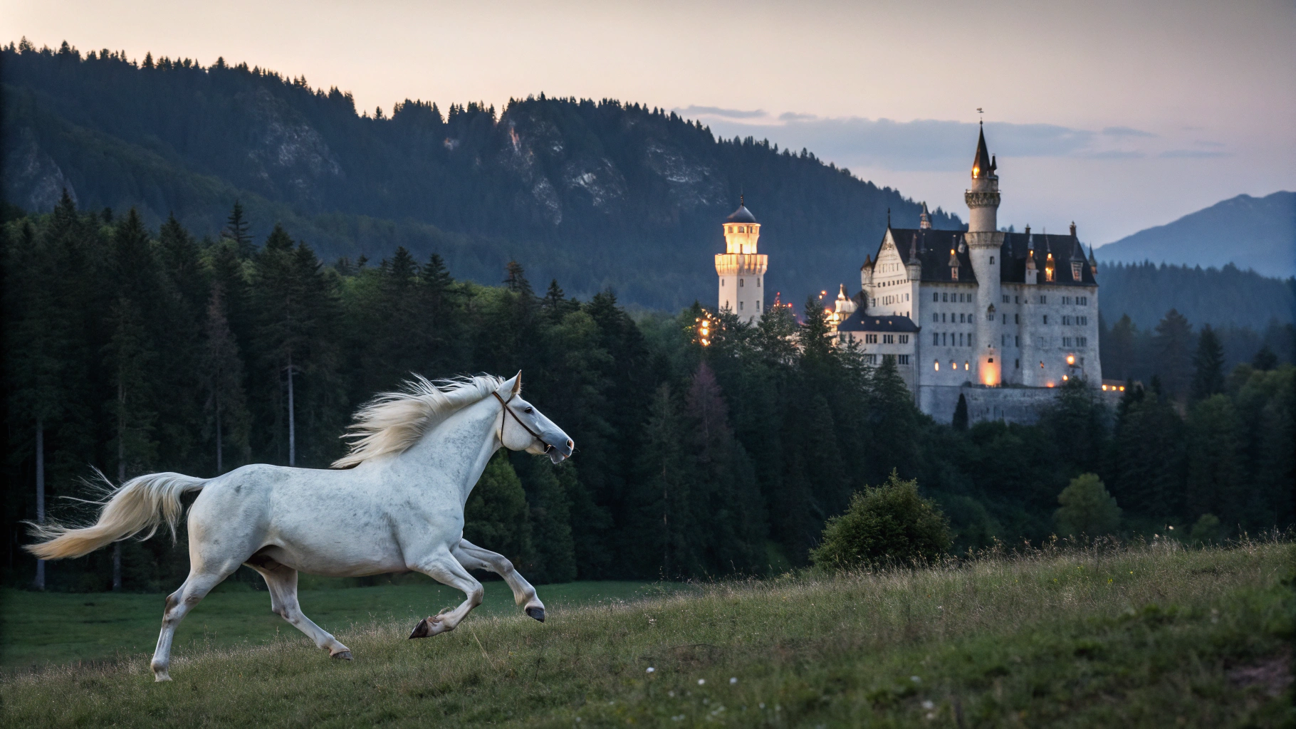 📍Запрос: Белая лошадь скачет рядом с величественным замком на фоне густого леса, атмосферная сцена в сумерках, мягкий свет подчеркивает детали замка и грива лошади развевается на ветру
