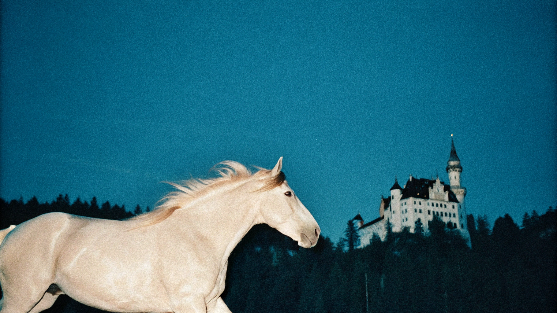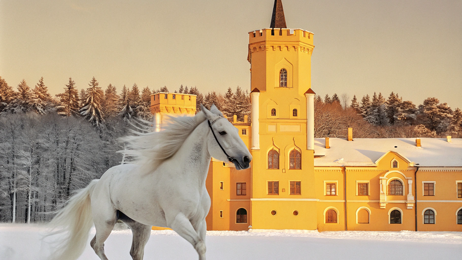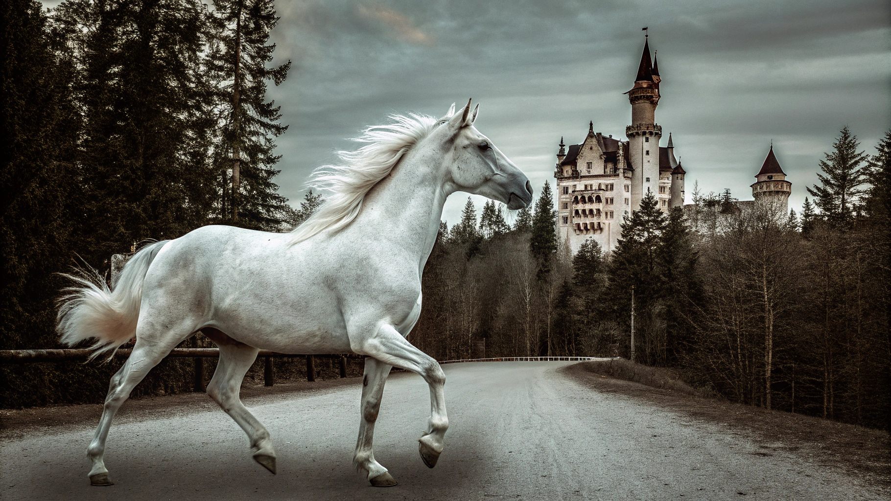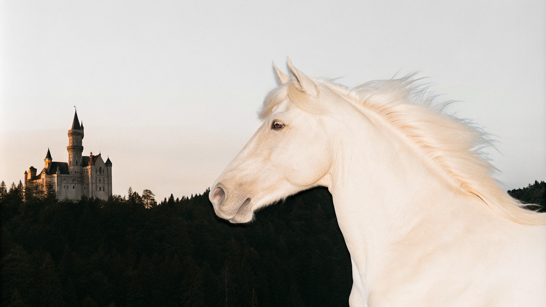 📍Запрос: Белая лошадь скачет рядом с величественным замком на фоне густого леса, атмосферная сцена в сумерках, мягкий свет подчеркивает детали замка и грива лошади развевается на ветру