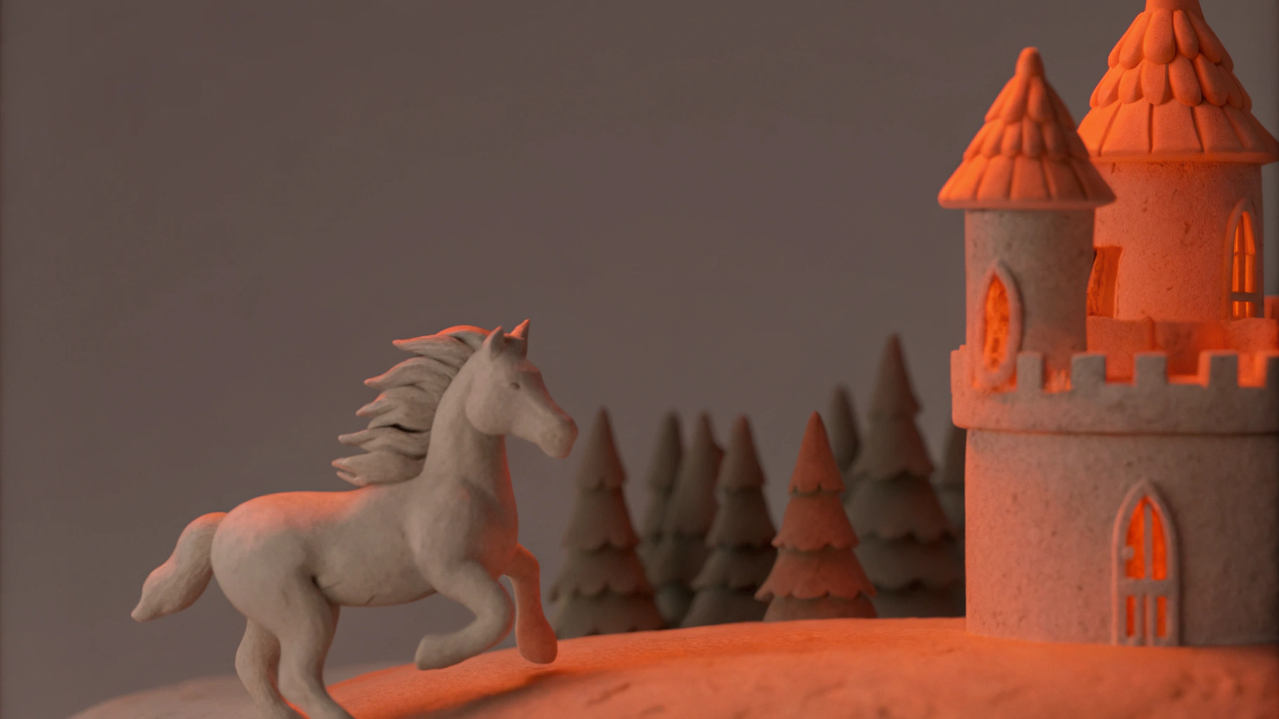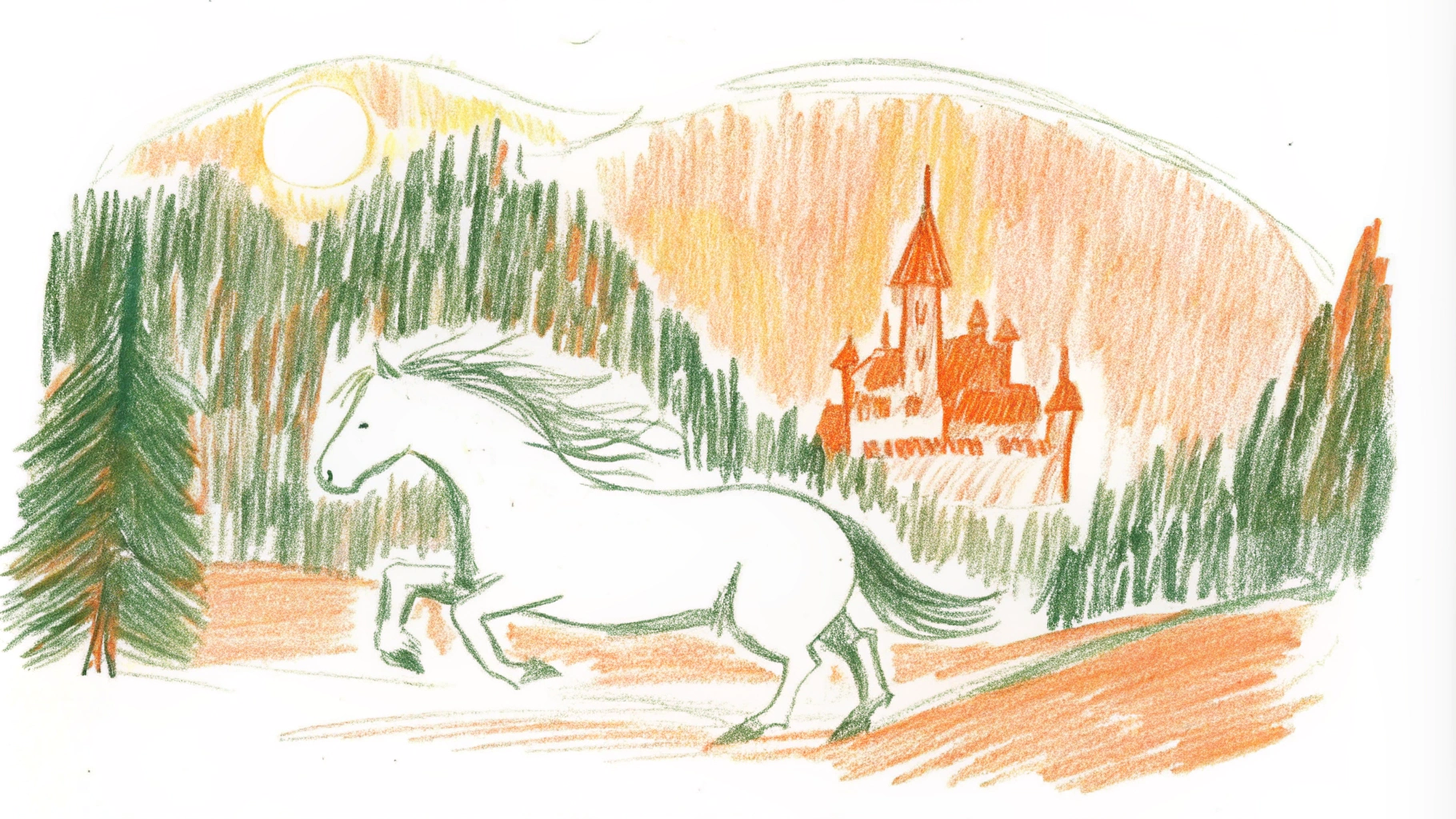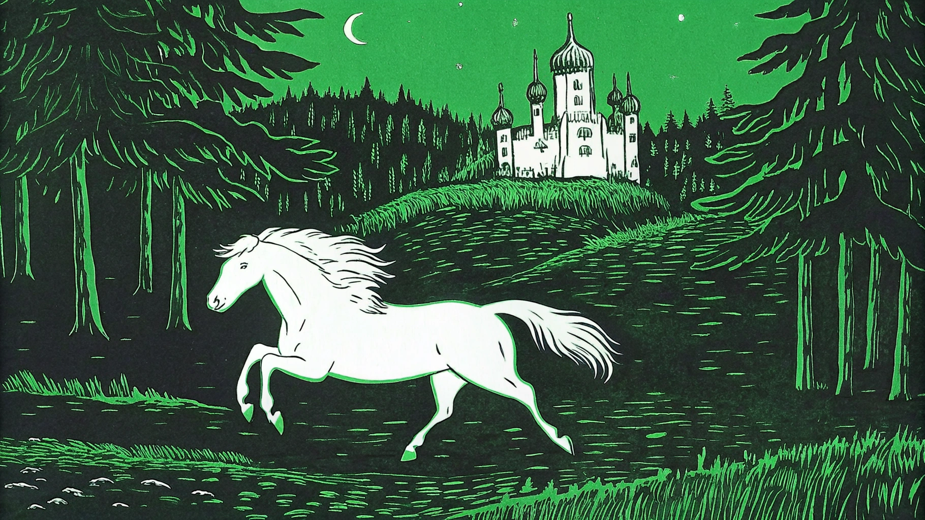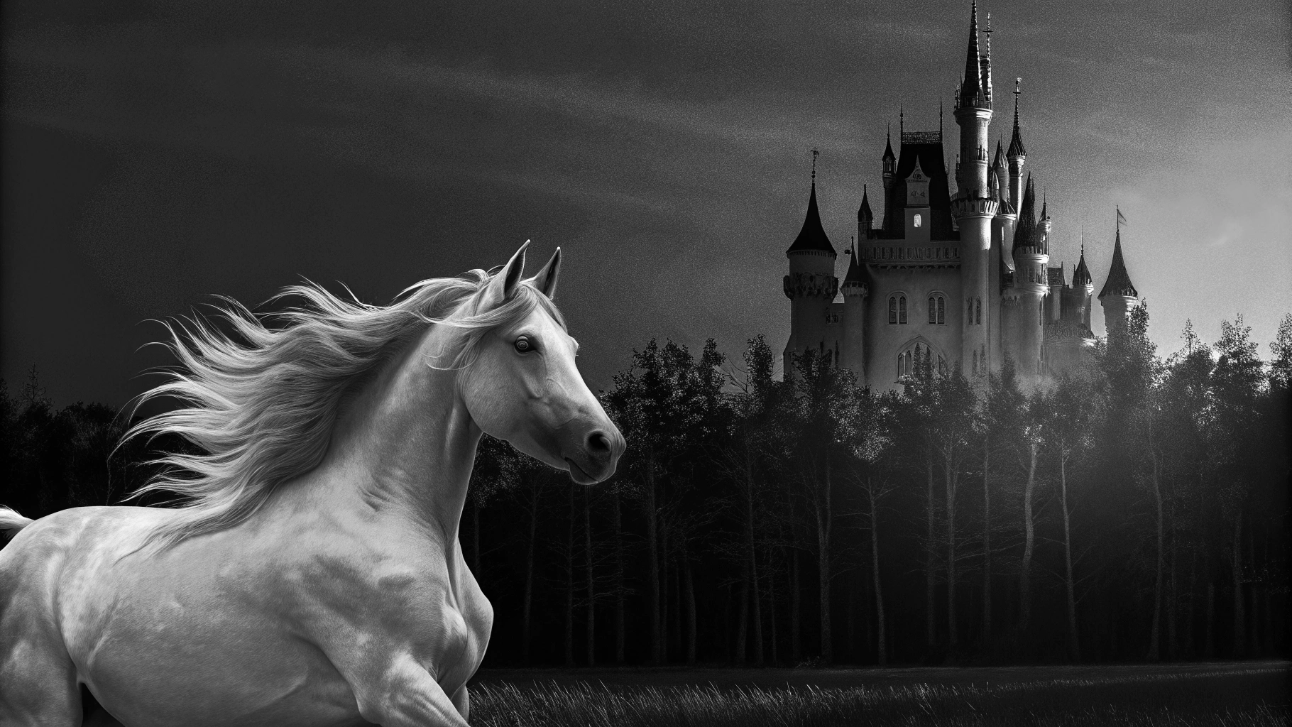 📍Запрос: Белая лошадь скачет рядом с величественным замком на фоне густого леса, атмосферная сцена в сумерках, мягкий свет подчеркивает детали замка и грива лошади развевается на ветру