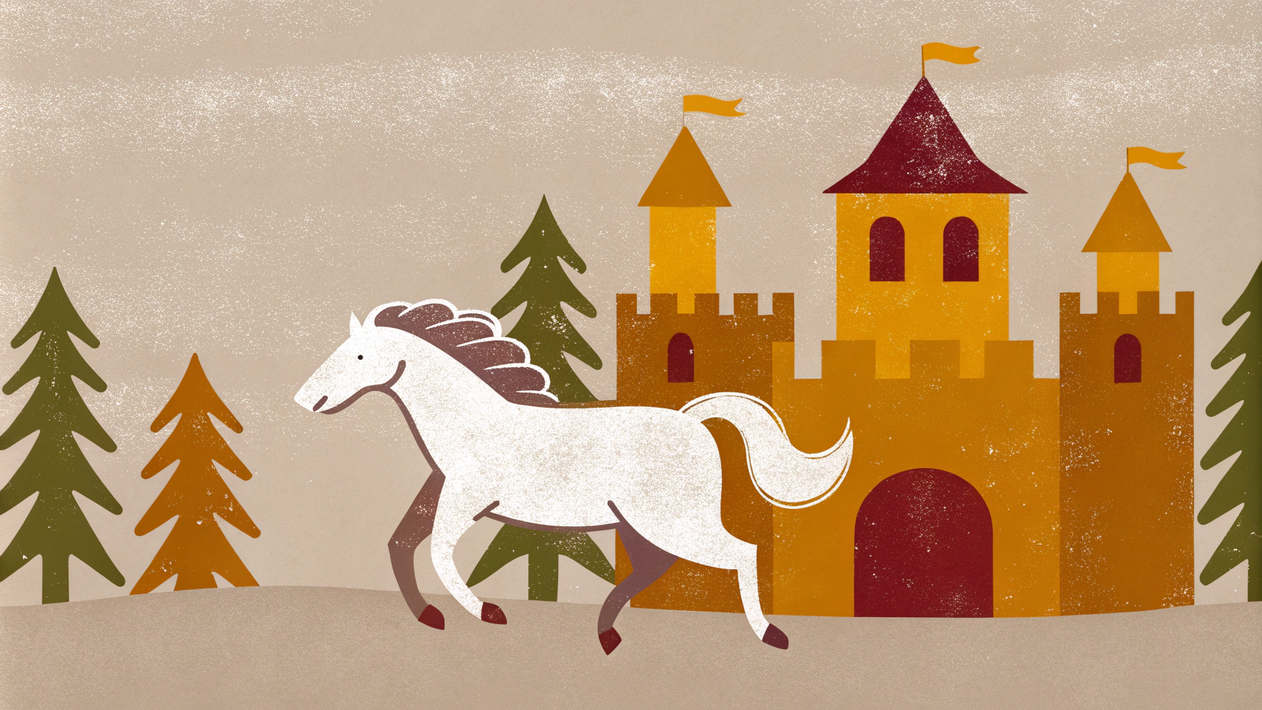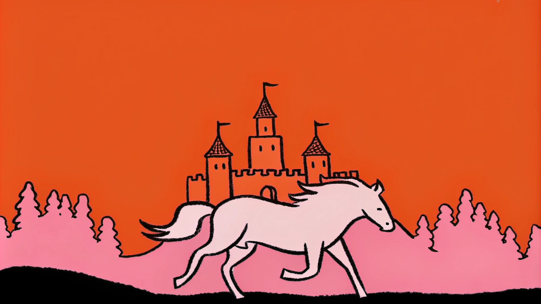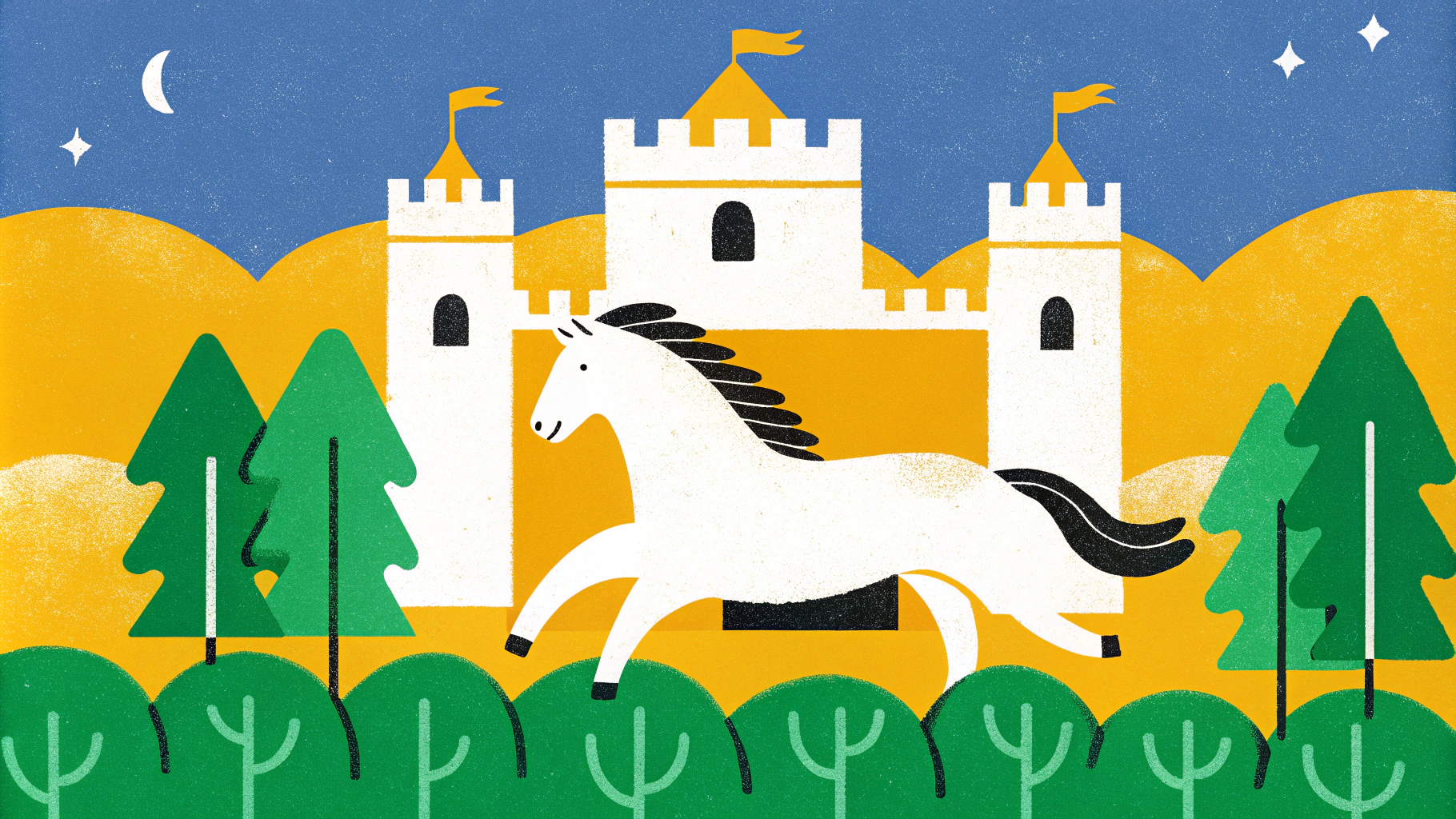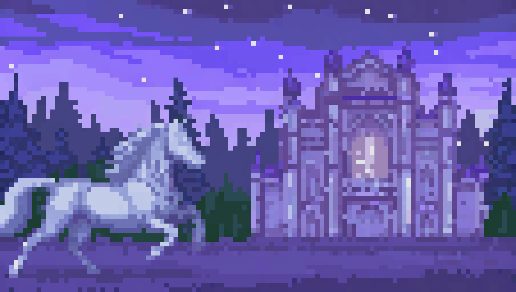 📍Запрос: Белая лошадь скачет рядом с величественным замком на фоне густого леса, атмосферная сцена в сумерках, мягкий свет подчеркивает детали замка и грива лошади развевается на ветру