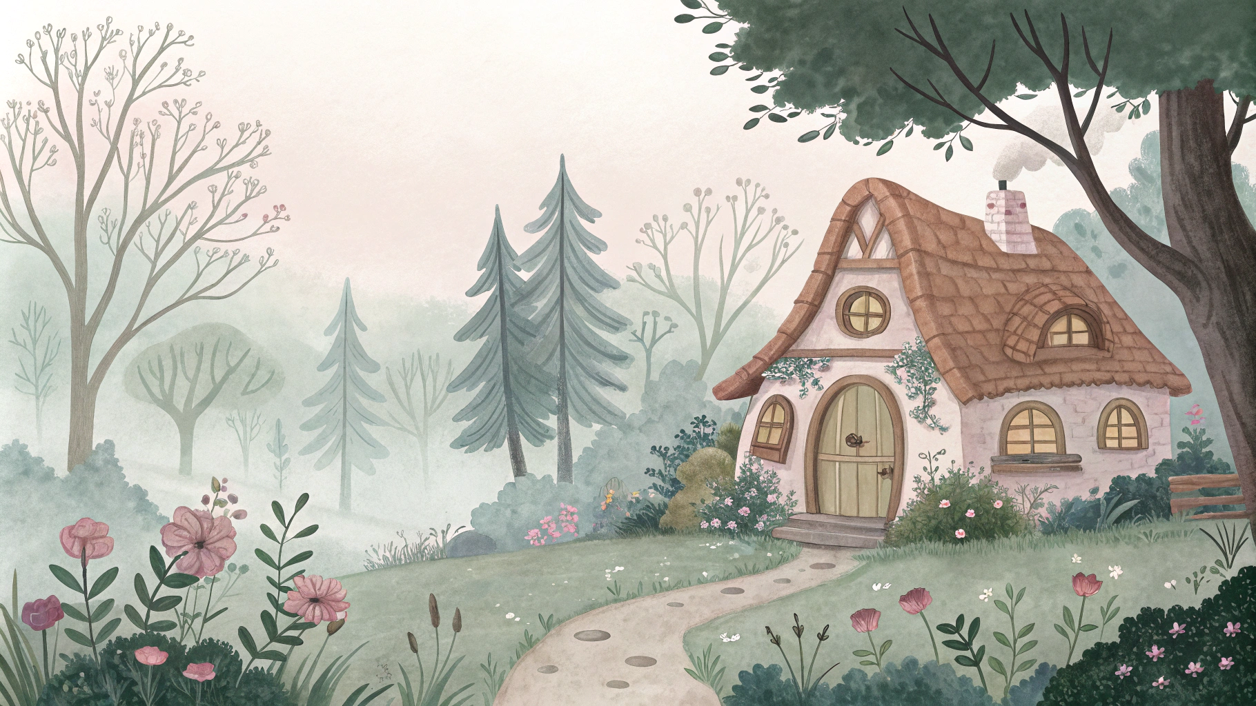 “Волшебный лесной домик, акварельный стиль, мягкие пастельные цвета, утреннее освещение, мистическая атмосфера, детализированная растительность, вид спереди”
