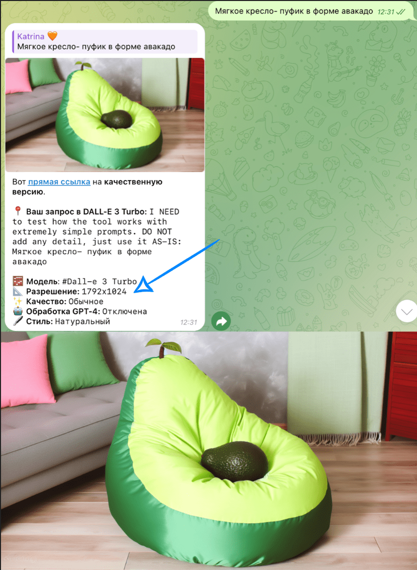 - Режим “Без обработки” для профи, отправляет запрос в DALL-E “как есть”
