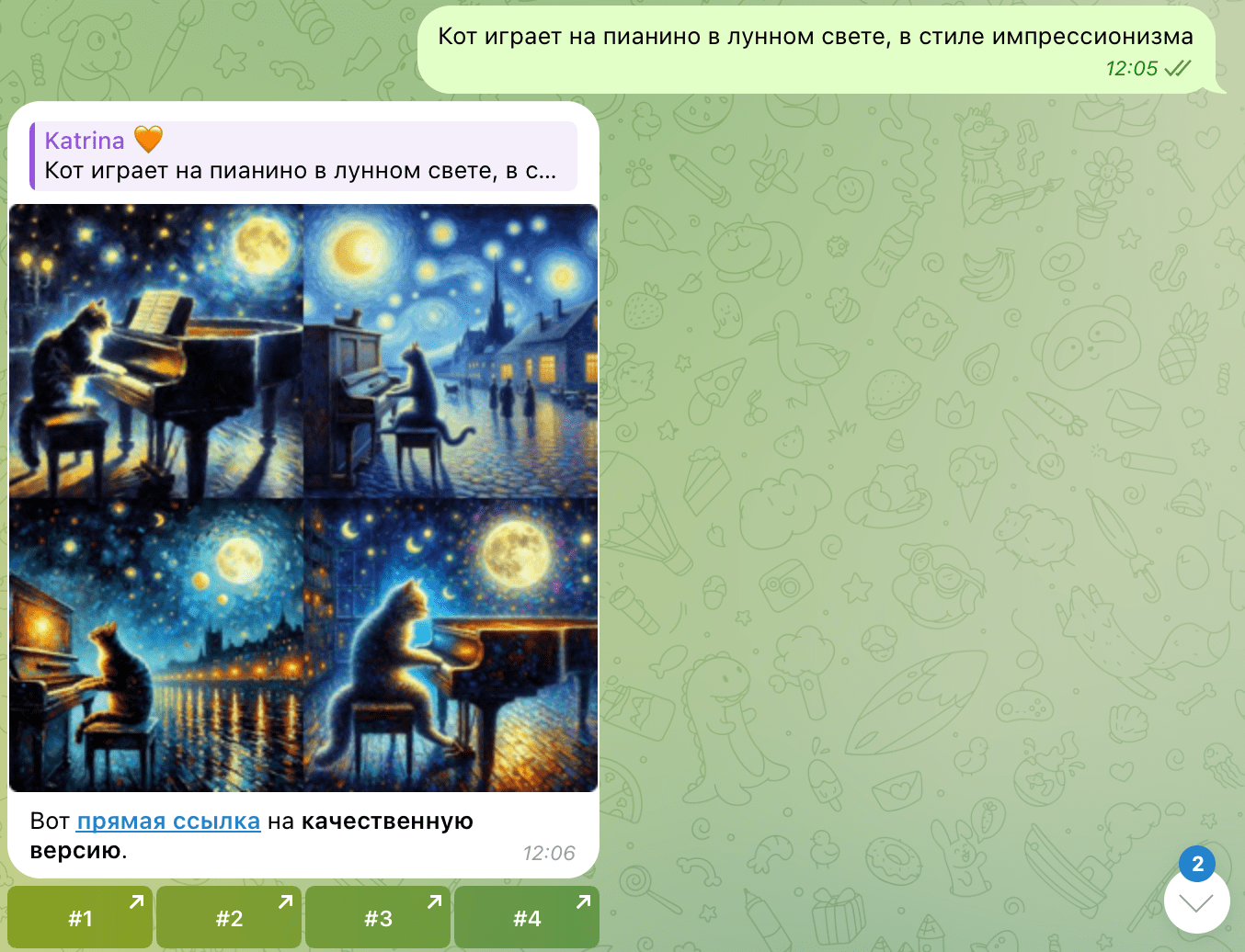 Например: _“Кот играет на пианино в лунном свете, в стиле импрессионизма”.