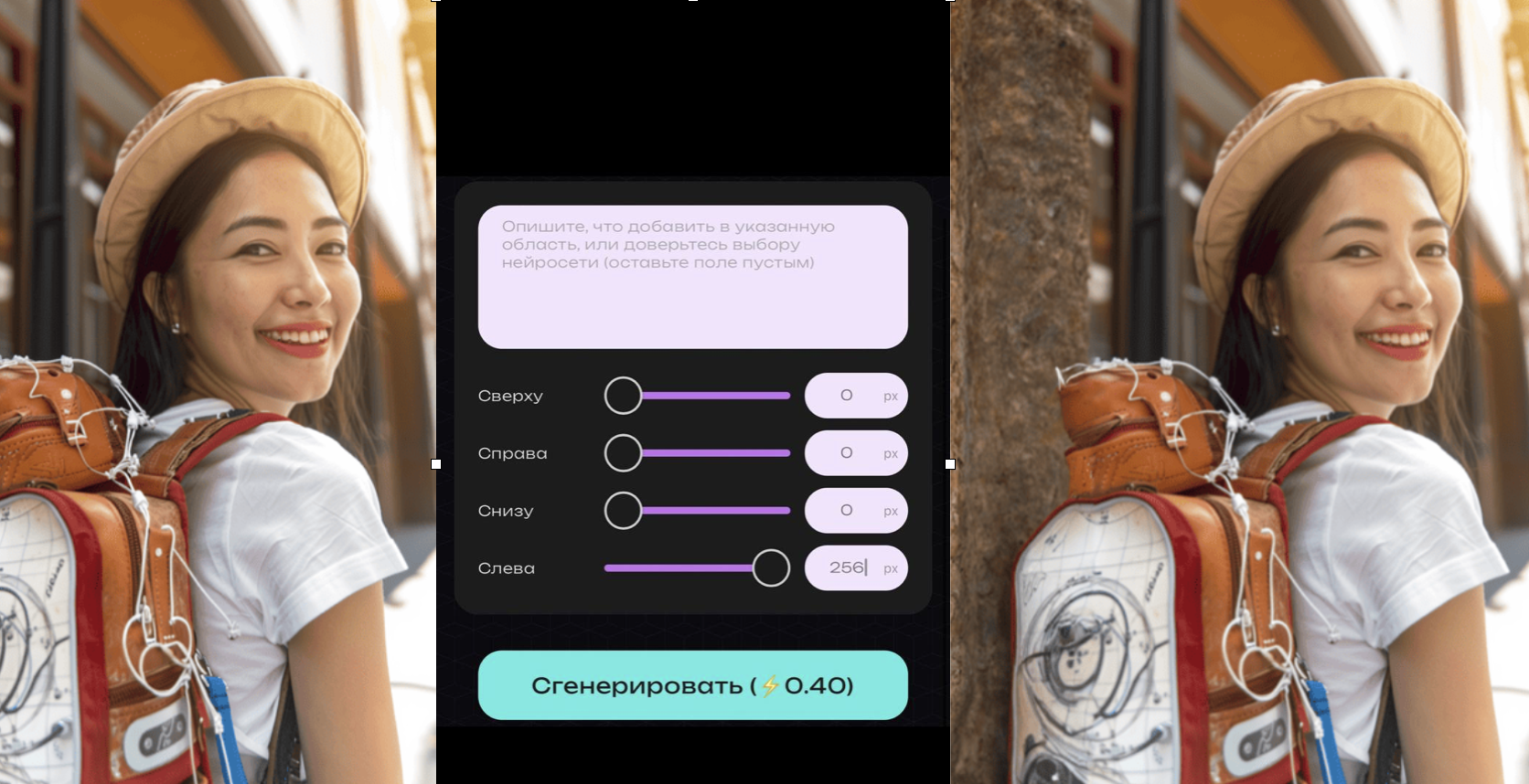 Загружаете изображение, выбираете инструмент «🖍 Дорисовать по сторонам», после чего выбираете стороны где хотите дорисовать изображение  и указываете промпт (запрос): что вы хотите видеть на изображении. Инструмент вносит изменения на выделенной стороне согласно указаниям.