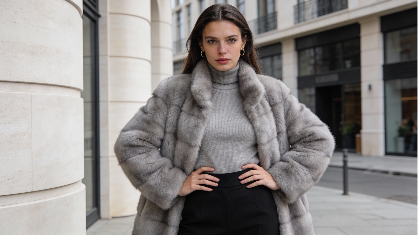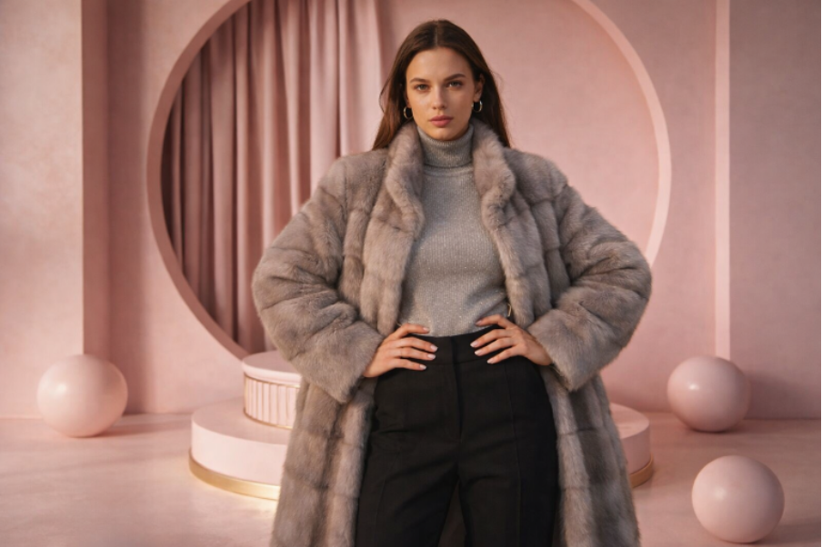 «Сгенерируй изображение девушки, стоящей на фэшн-фоне с розоватым оттенком, как в первом изображении. Необходимо сохранить внешность девушки идентичной модели со второго изображения. Девушка одета в серую шубу, повторяя стиль одежды из второго изображения. Освещение - теплое, с мягкими тенями, подчёркивающее текстуры ткани. Стиль изображения - фотореализм с кинематографичной атмосферой.»