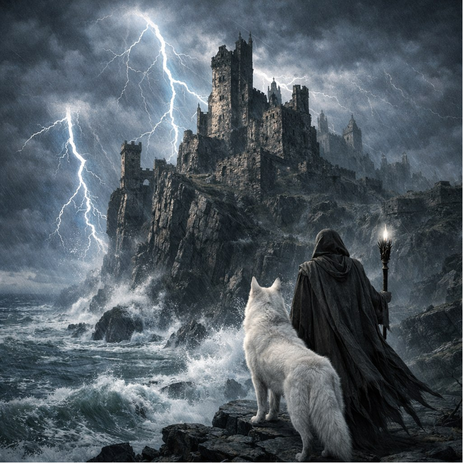 Широкоформатная фэнтезийная сцена: заброшенная крепость на скалистом утёсе под грозовым небом, молнии освещают разрушенные башни, внизу бушует океан. На переднем плане — фигура в тёмном плаще с посохом, повернута спиной. Атмосфера — мрачная и эпическая, в стиле иллюстрации к тёмному фэнтези, с высокой детализацией камня, неба и воды.