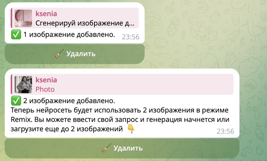 После загрузки изображений и отправки соответствующего текстового запроса вы получите качественный результат обработки.