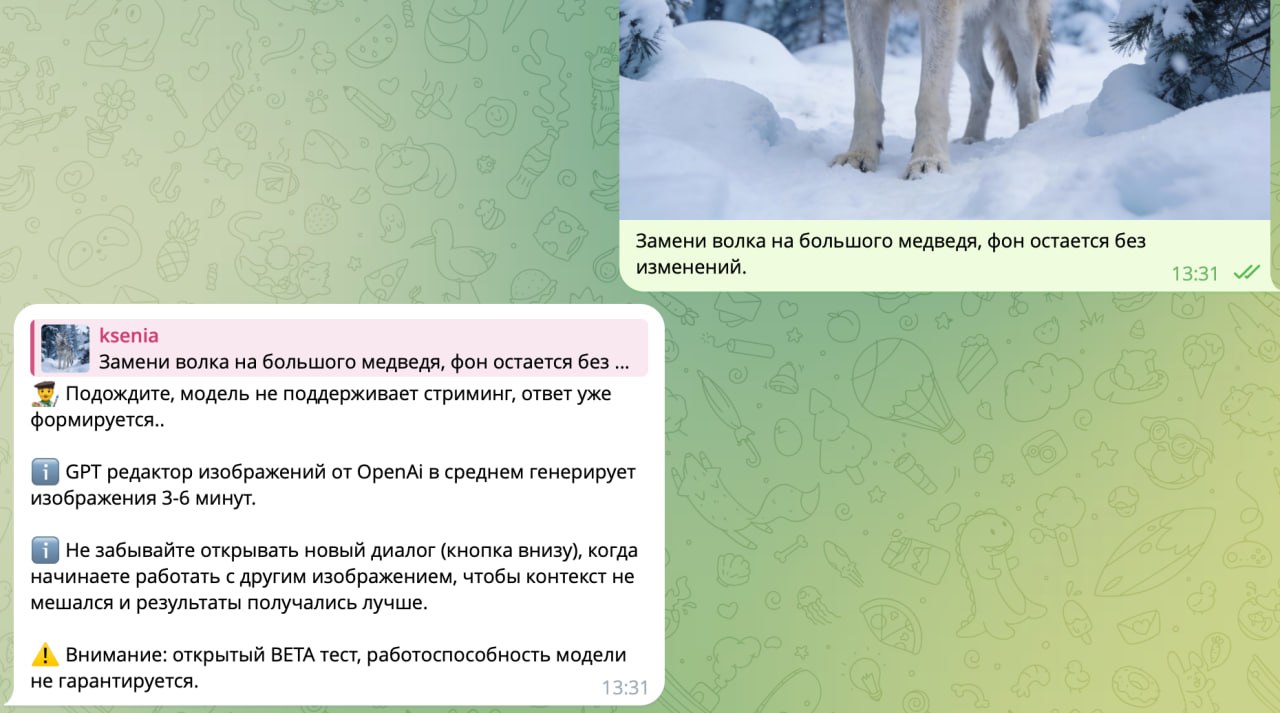 ❣️В ответ на ваш запрос вы получите сообщение о том, что ответ формируется. Это не ошибка, а процесс создания генерации. Через несколько минут вам будет отправлен готовый результат.