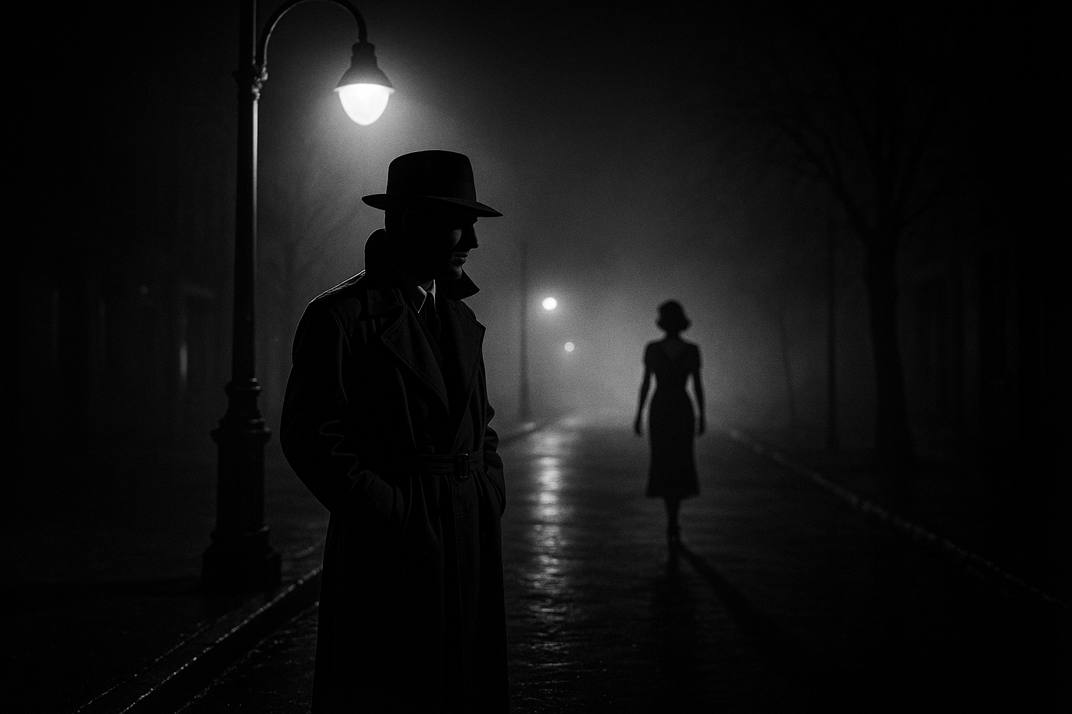 Детектив в шляпе и плаще стоит под уличным фонарем в туманную ночь, длинные тени падают на мокрый тротуар, вдалеке виднеется силуэт женщины в элегантном платье, атмосфера таинственности и опасности пронизывает сцену