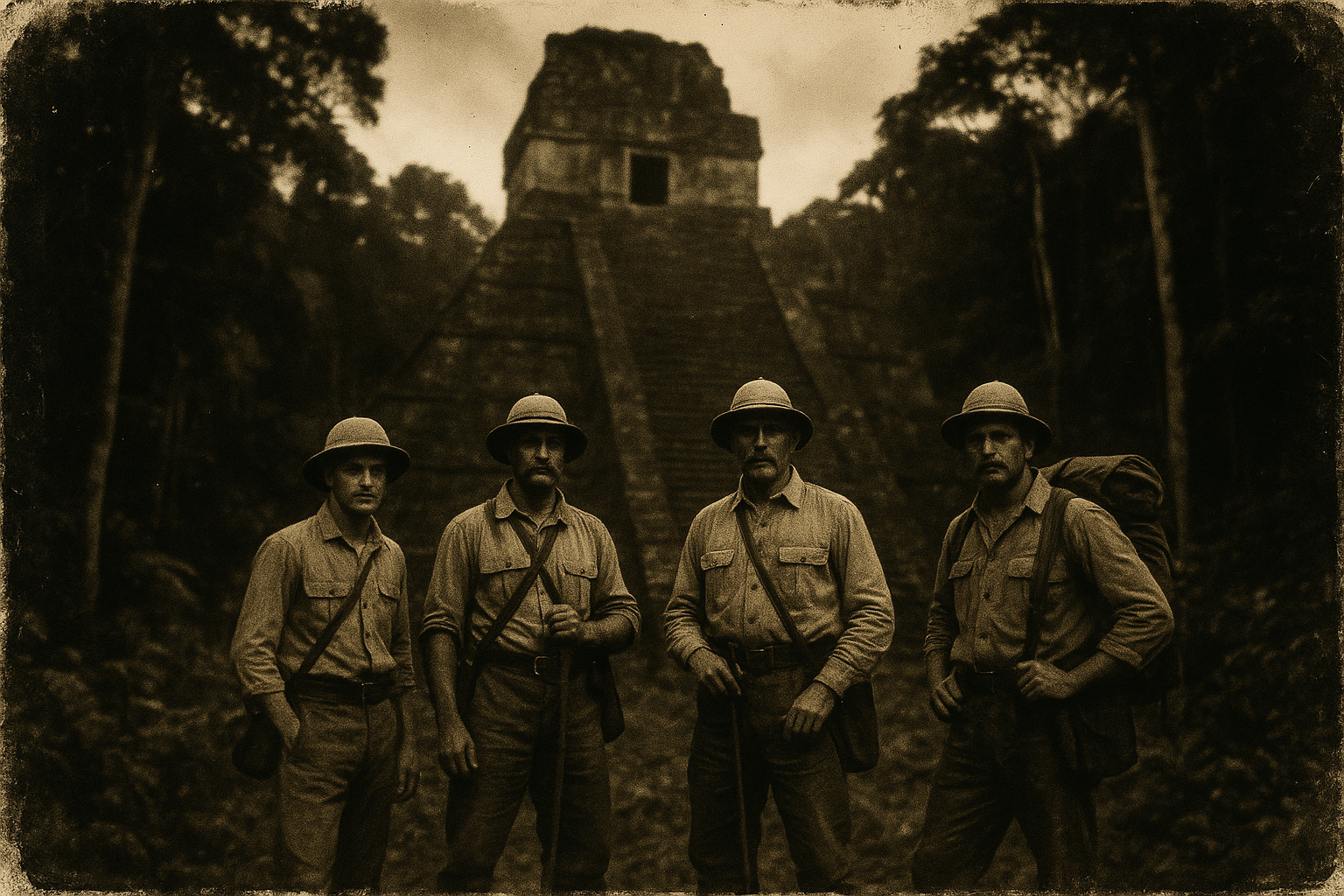Старая фотография 1920-х годов: группа исследователей в колониальных костюмах стоит перед недавно обнаруженной древней пирамидой в джунглях, потертые края изображения, следы времени и выцветшие оттенки сепии придают аутентичность историческому моменту