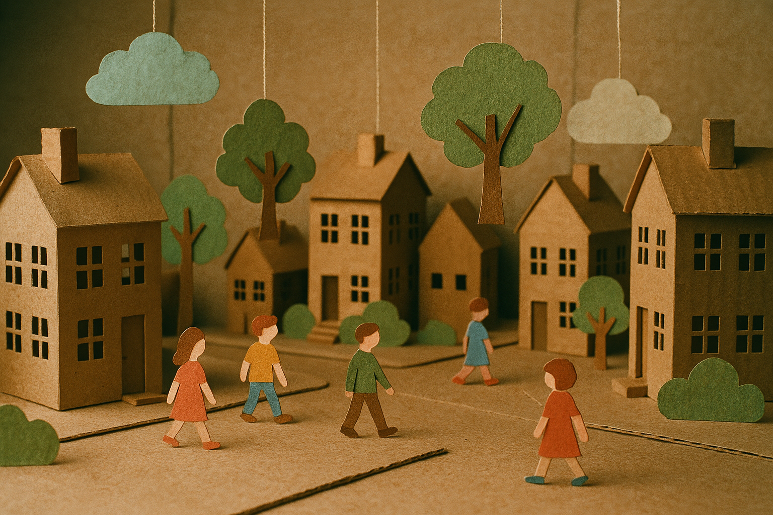 Миниатюрный городок, полностью созданный из картона и цветной бумаги: маленькие бумажные люди гуляют по улицам, картонные домики с вырезанными окнами, бумажные деревья и облака подвешены на нитках, видны текстуры бумаги и аккуратные склейки