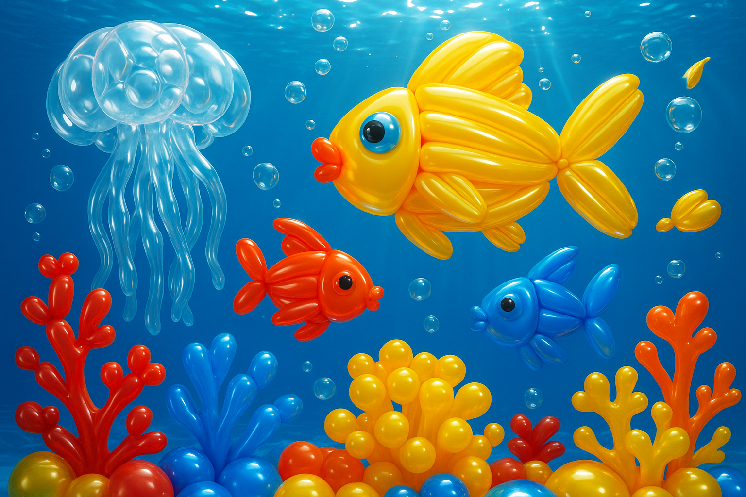 Фантастический подводный мир, где все существа и растения созданы из воздушных шаров: медуза из прозрачных шариков, рыбы из скрученных длинных шаров, кораллы из множества маленьких цветных шариков, пузырьки воздуха поднимаются к поверхности, блики света играют на глянцевых поверхностях