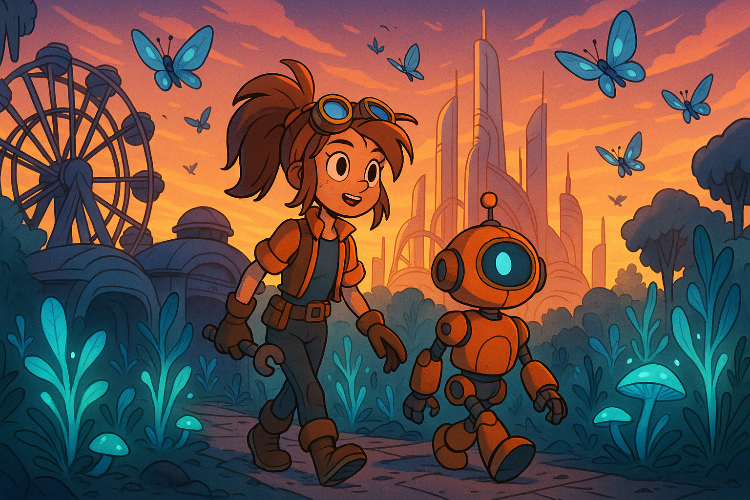 Юная изобретательница и ее робот-компаньон исследуют заброшенный парк развлечений будущего, заросший странными светящимися растениями, вокруг летают механические бабочки, на горизонте видны башни футуристического города, освещенные закатным солнцем