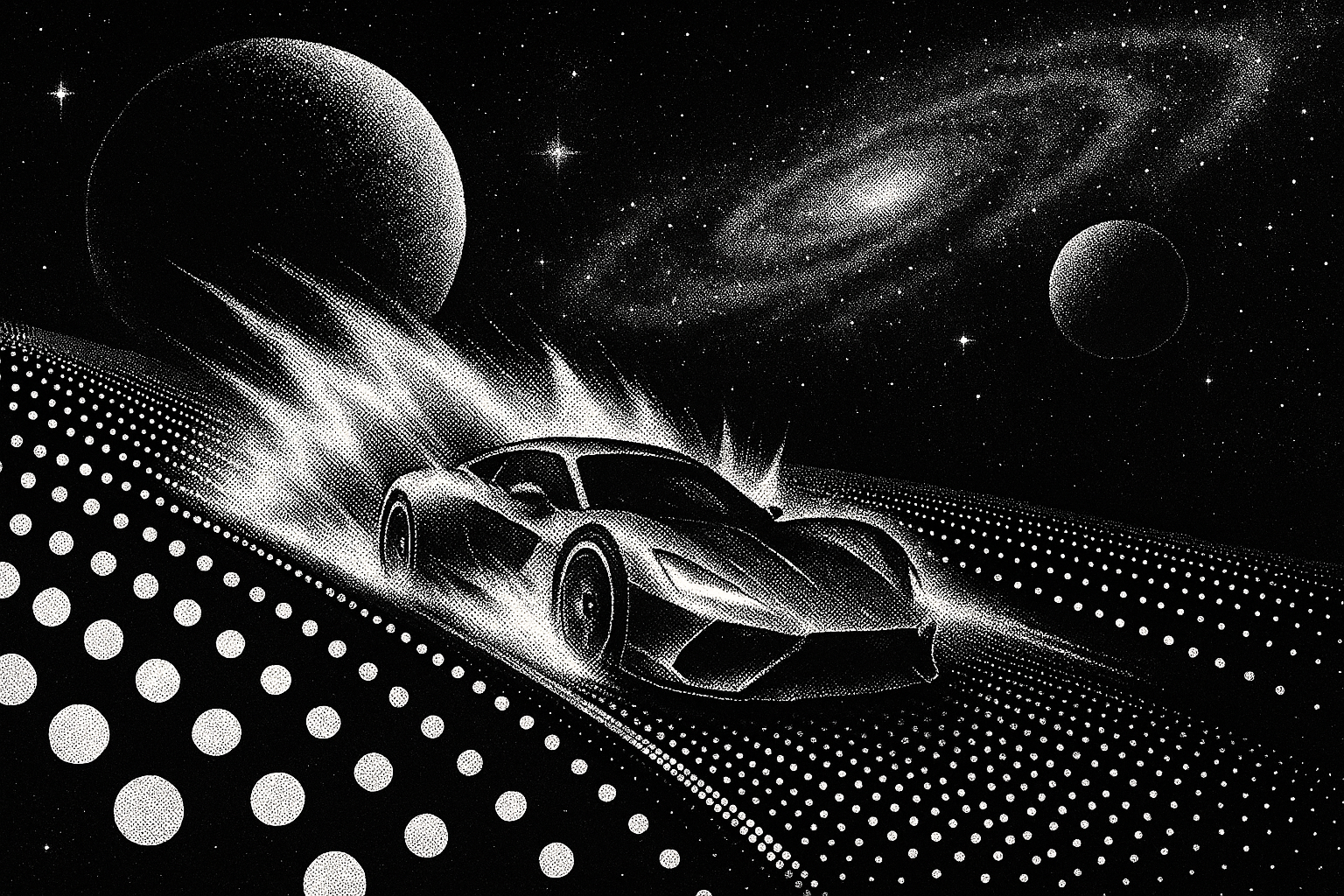 Эпический момент космической гонки: футуристический спортивный автомобиль разрывает звуковой барьер на трассе, парящей между планетами, невероятные визуальные эффекты, драматическое освещение, звезды и галактики на заднем плане, момент максимального напряжения и зрелищности.