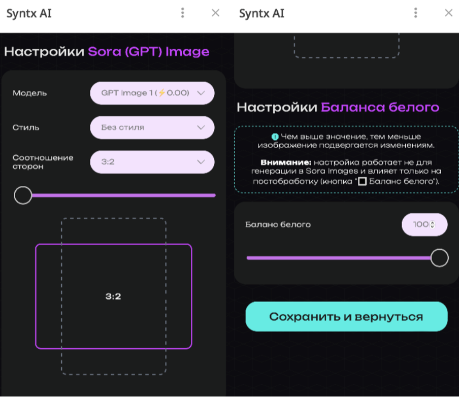 • Опция «Баланс белого» задействуется только на этапе пост-обработки и не влияет на исходную генерацию в SORA Images.