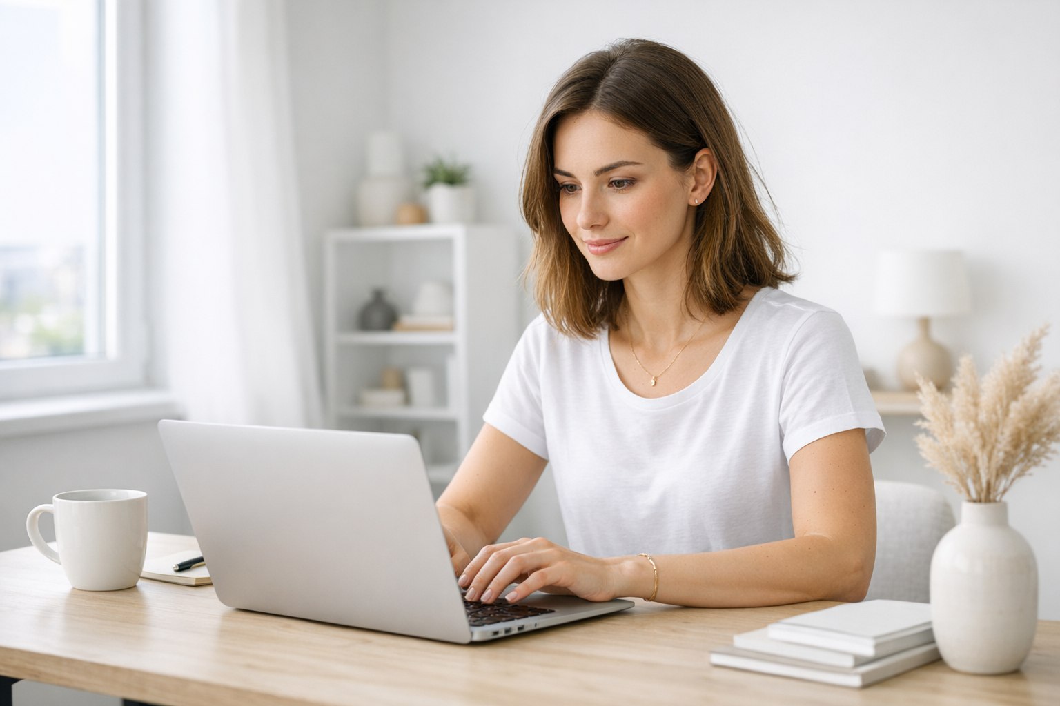 Пример: «Молодая женщина работает за ноутбуком в светлой студии. Реалистичный стиль, дневной свет из окна, аккуратные руки и лицо, минималистичный интерьер, высокая детализация.»