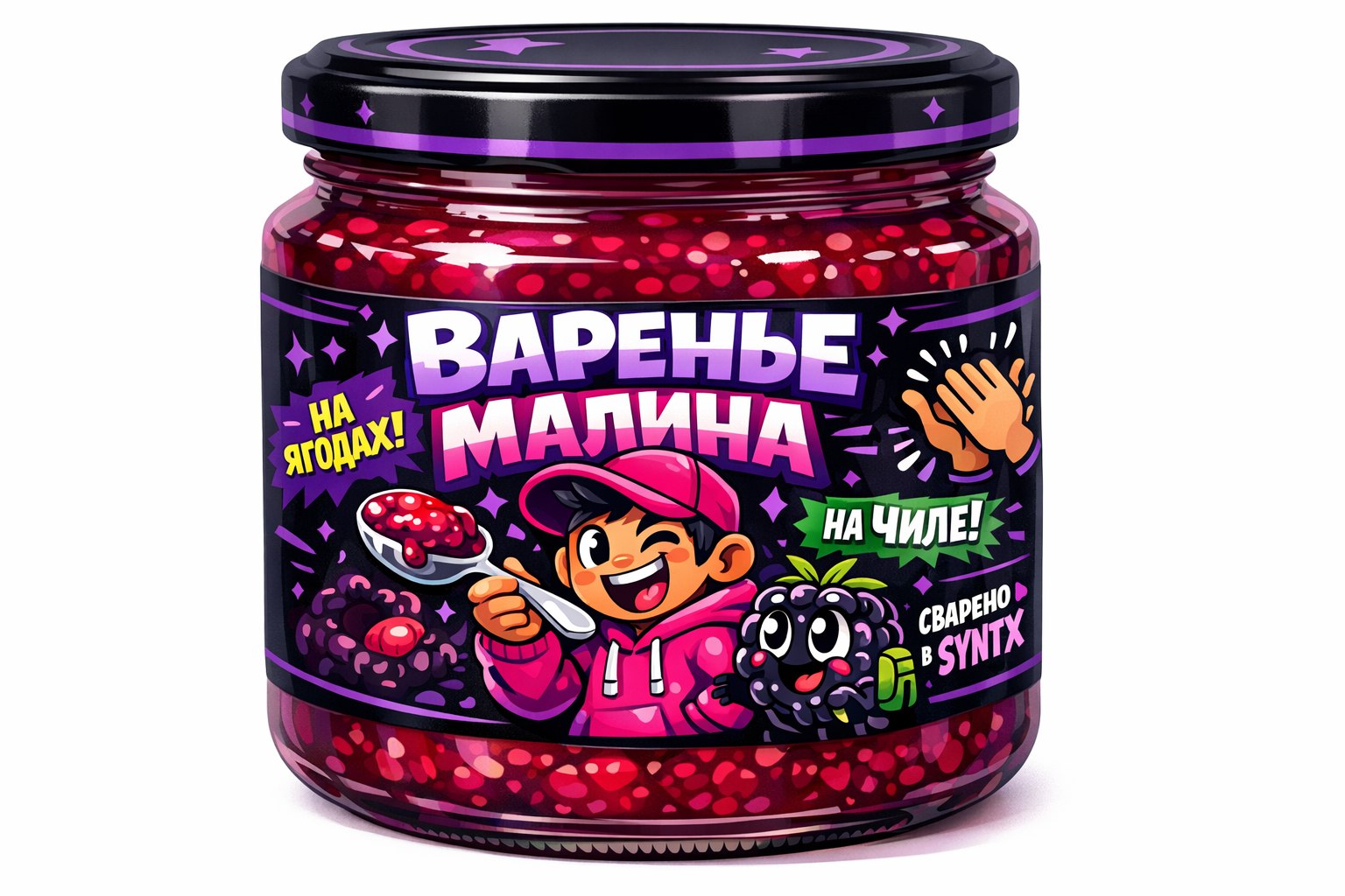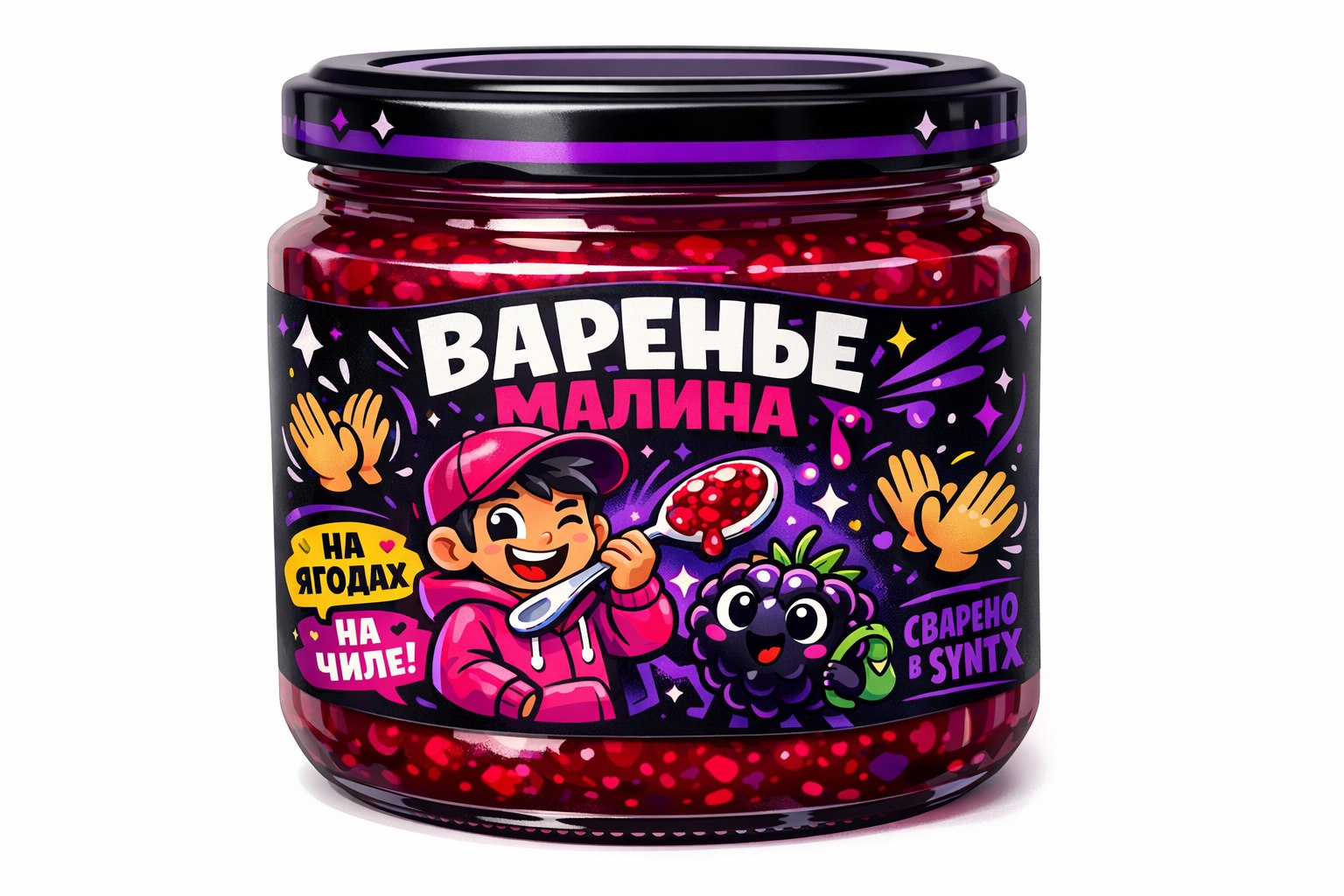 «Стеклянная банка малинового варенья с креативным этикеточным дизайном в мультяшном стиле. Основная цветовая гамма — глубокий чёрный и яркий фиолетовый. На передней этикетке изображён жизнерадостный персонаж в ярко-розовой худи и кепке, держащий ложку с вареньем. Рядом с ним — мультяшная чёрная малина с небольшим рюкзаком.