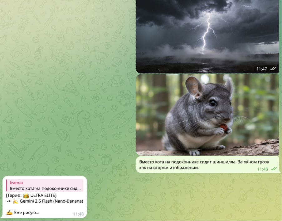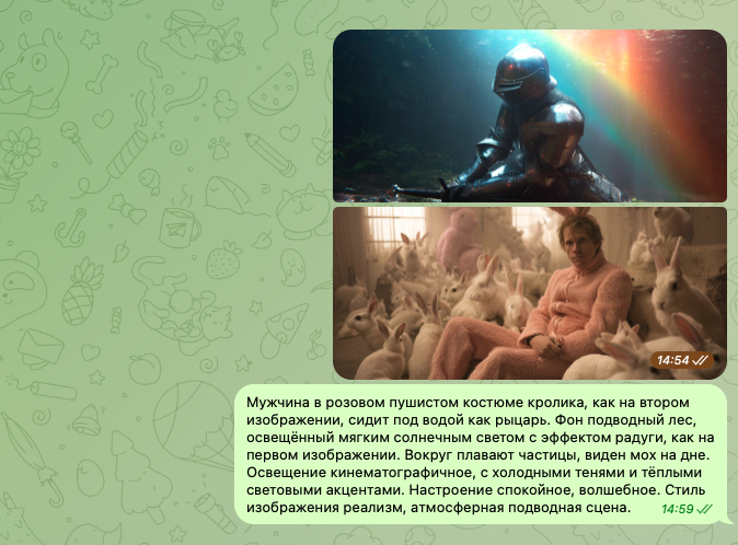 После загрузки изображений и отправки соответствующего текстового запроса вы получите качественный результат обработки.