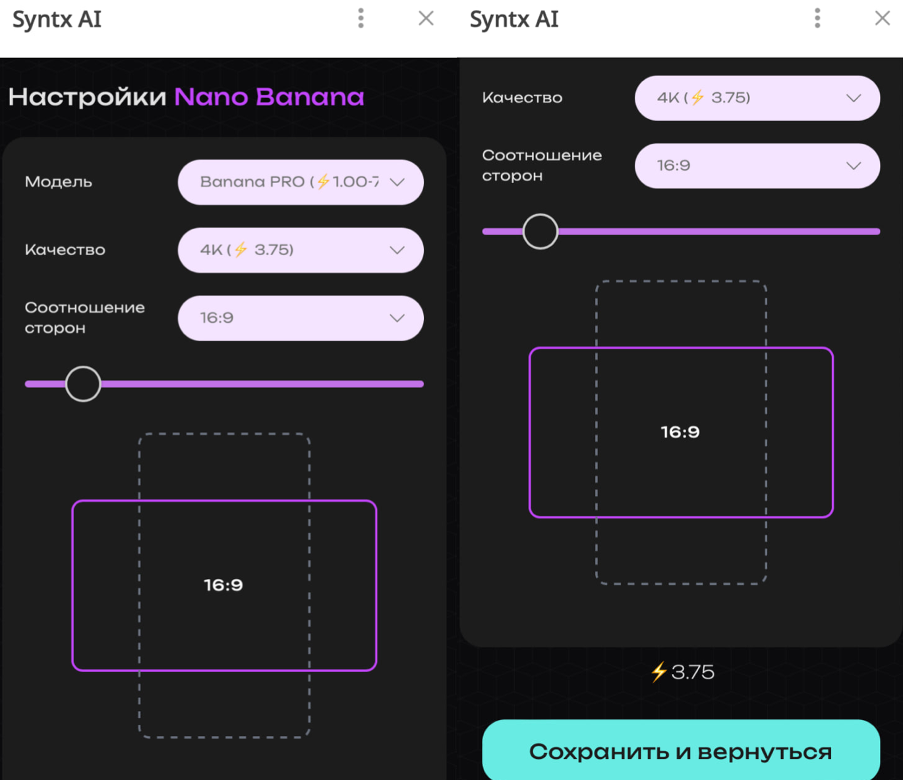 • При загрузке референсных изображений с различным соотношением сторон в модели Nano Banana Pro, за основу для генерации будет автоматически выбрано соотношение сторон первого загруженного изображения.