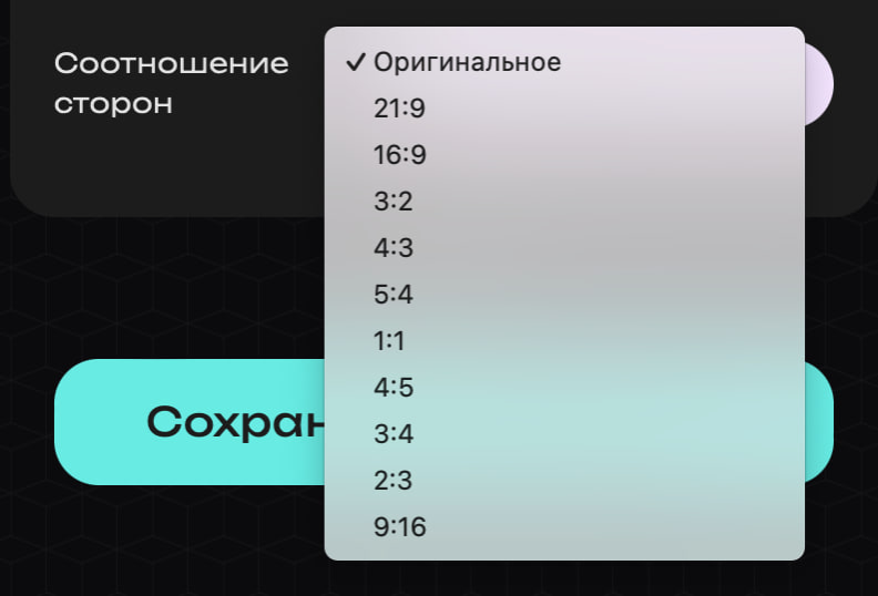 Вам предоставляется возможность выбора соотношения сторон. Вы можете выбрать «Оригинальное» соотношение, либо одно из 10 предложенных форматов.