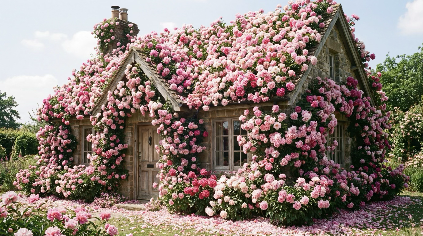 «Растения начинают постепенно появляться на поверхности дома: тонкие побеги медленно прорастают вдоль стен, цветы раскрываются один за другим. Зелень мягко расползается по фасаду, обвивая окна и края здания. Стиль - кинематографичный, реалистичный, с насыщенной, но естественной цветовой палитрой».