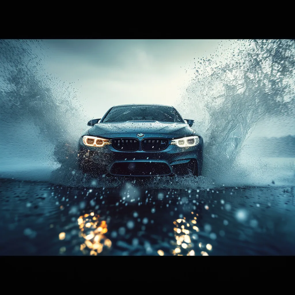 A BMW car driving through water, water droplets flying through the air, close-up, highly detailed, high-speed photography, cinematic