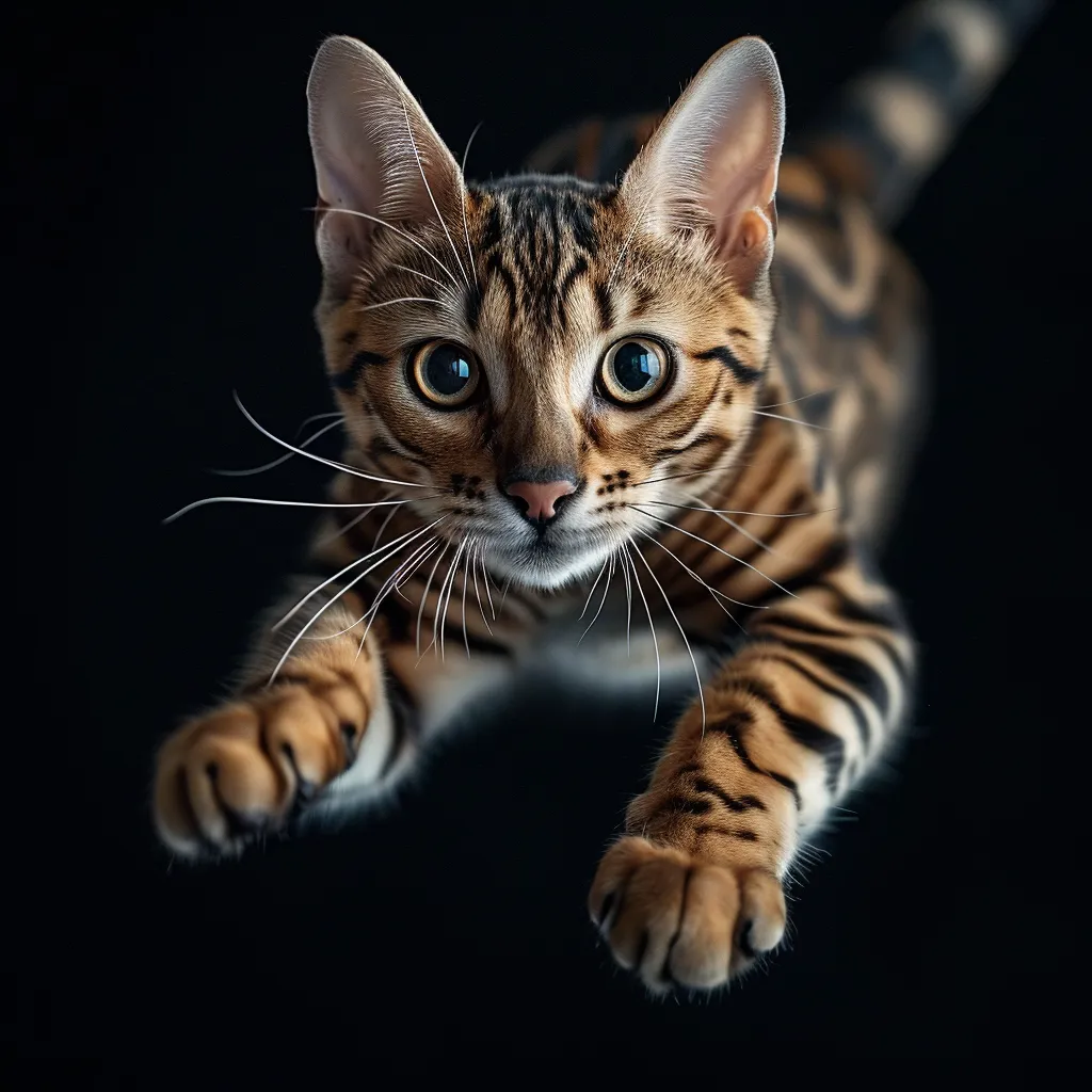 bengal cat is jumping in fear, close-up, highly detailed, high-speed photography, cinematic