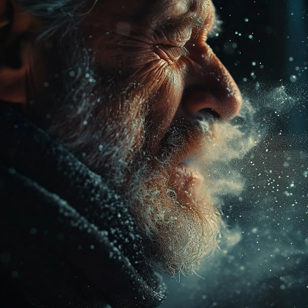 man is sneezing, close-up, highly detailed, high-speed photography, cinematic