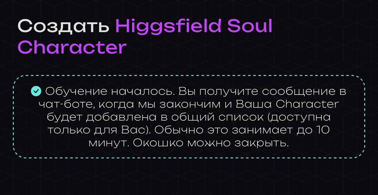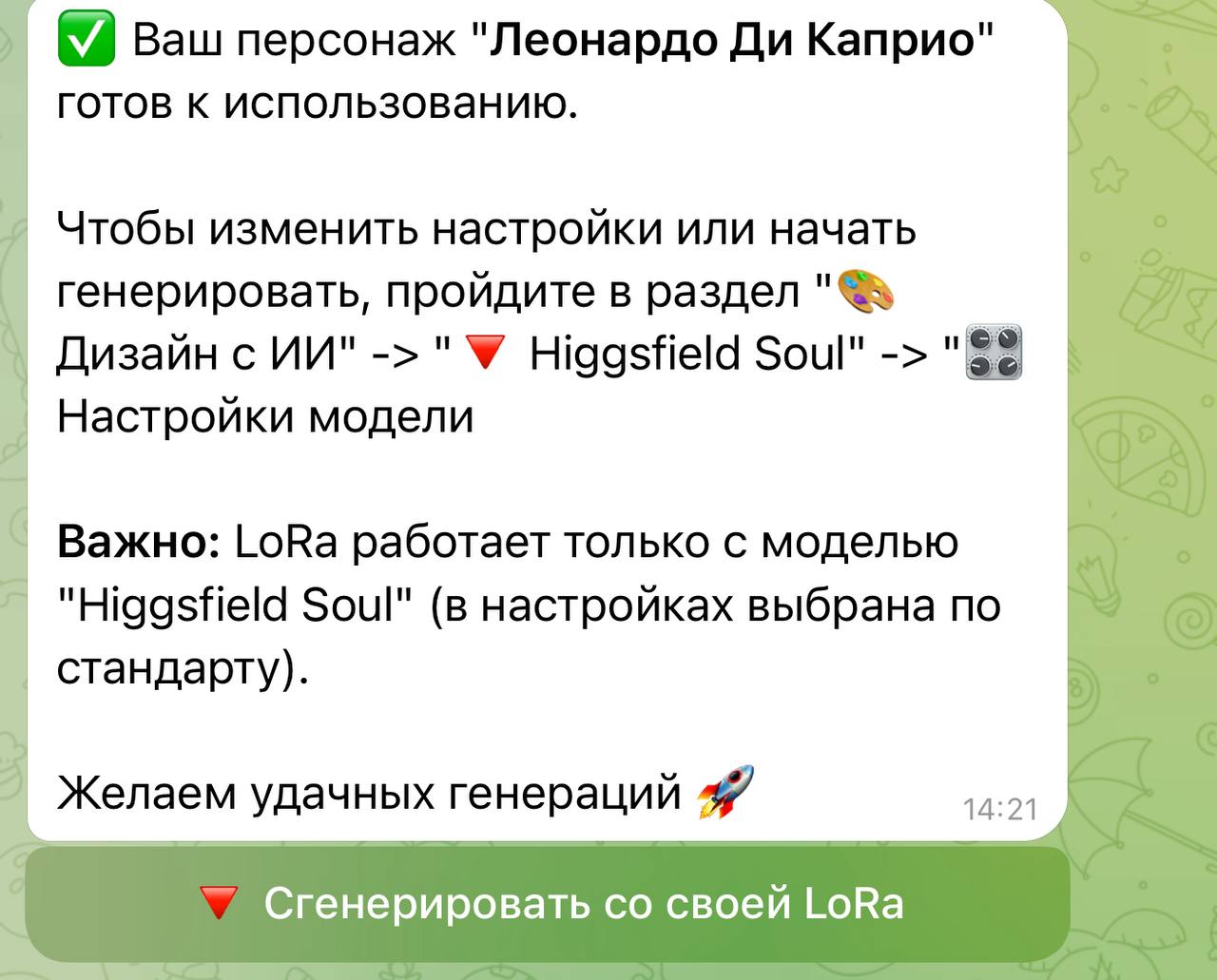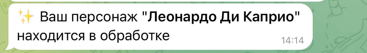 Как только ваша модель персонажа будет готова, вы получите уведомление прямо внутри чат-бота. Это позволяет вам эффективно использовать время, не дожидаясь окончания обучения.