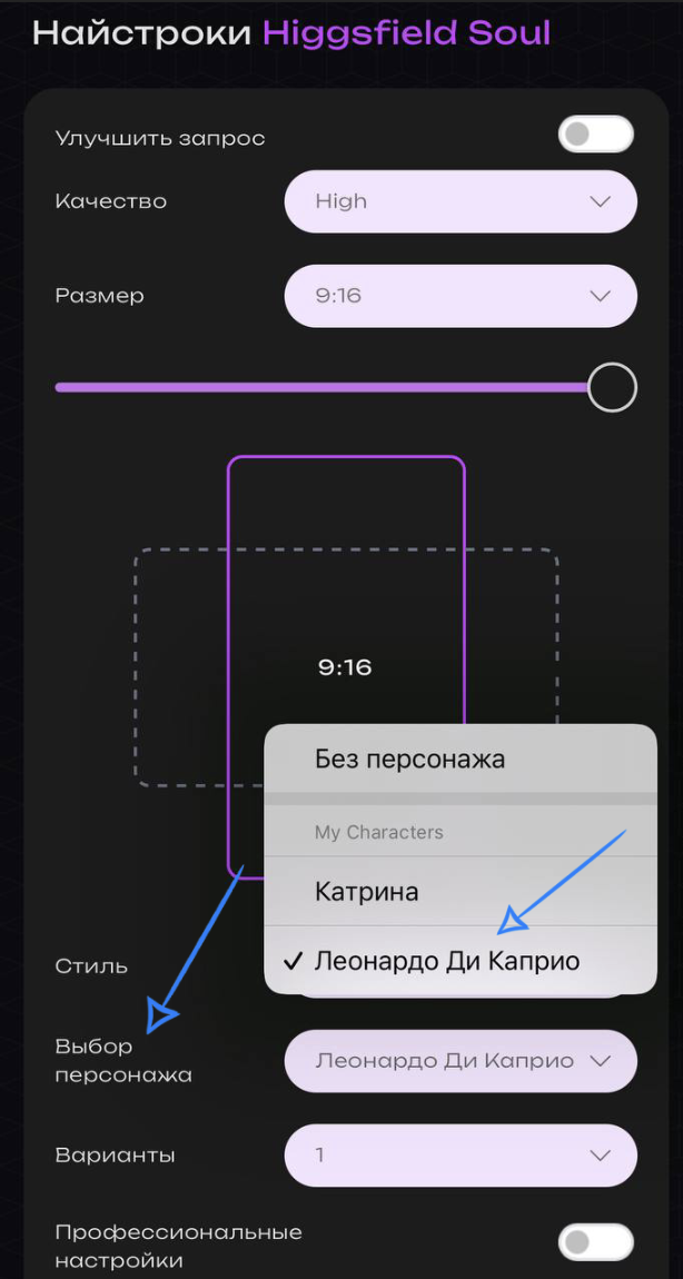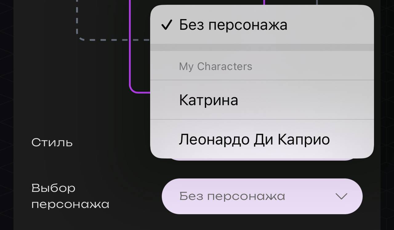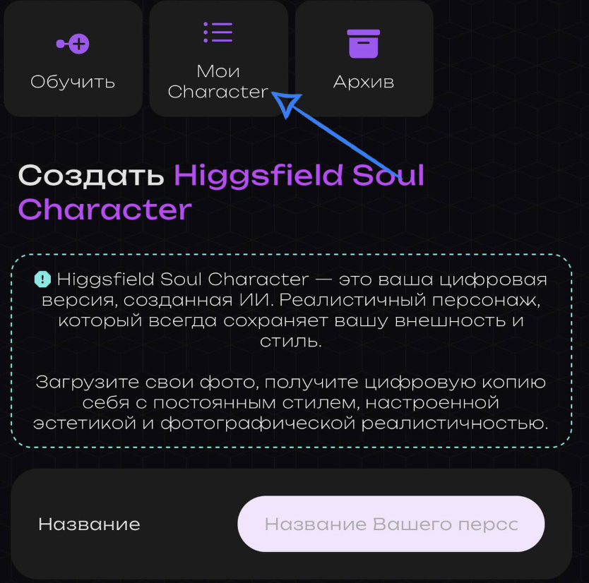 В этом разделе у вас появляется уникальная возможность создавать изображения персонажей с индивидуальной внешностью. Если вы ранее создали собственную модель через Higgsfield Soul Character, здесь отобразятся названия всех ваших моделей. Выбрав одну из них, вы сможете генерировать изображения, основанные на внешности выбранного персонажа, сохраняя его уникальные черты в каждом новом образе.