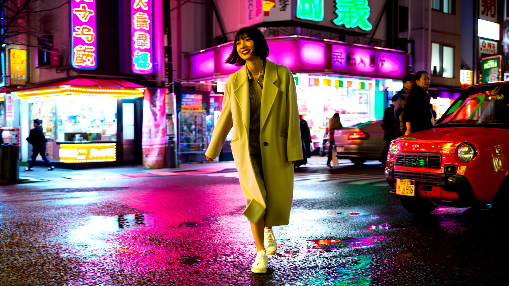 Молодая женщина с короткими тёмными волосами идёт по улице Токио вечером, на ней длинное бежевое пальто и белые кроссовки. Вокруг неоновые вывески отражаются в лужах после дождя. Она улыбается, слегка наклоняясь вперёд, будто говорит с кем-то. Атмосфера живая и динамичная, стиль Tokyo Street, освещение ночное, с яркими цветными бликами.