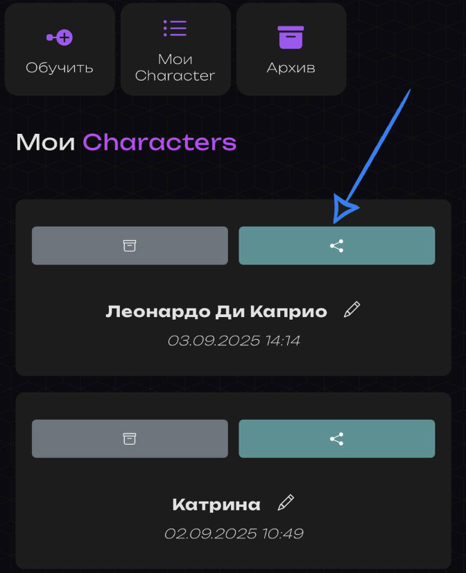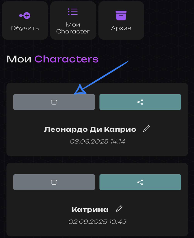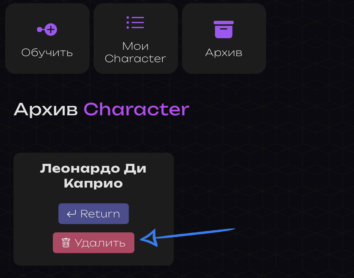 Кнопка “корзины” - позволяет вам перенести вашу модель в архив. В момент нахождения модели персонажа в архиве вы не будете видеть её в списке, который предоставляется в “Настройках модели”.