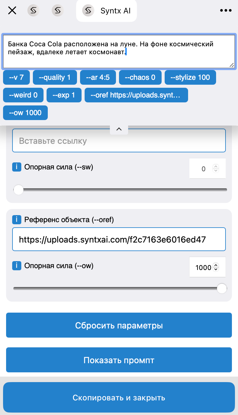 ΠΠ°Π»Π΅Π΅ Π½Π°ΠΆΠΌΠΈΡΠ΅ Β«Π‘ΠΊΠΎΠΏΠΈΡΠΎΠ²Π°ΡΡ ΠΈ Π·Π°ΠΊΡΡΡΡΒ». Π’Π°ΠΊΠΈΠΌ ΠΎΠ±ΡΠ°Π·ΠΎΠΌ Π²Ρ ΡΠΎΡ ΡΠ°Π½ΠΈΡΠ΅ Π²ΡΠ΅ ΠΏΠ°ΡΠ°ΠΌΠ΅ΡΡΡ ΠΈ Π½Π°ΡΡΡΠΎΠΉΠΊΠΈ ΠΈΠ· ΡΠ΅Π΄Π°ΠΊΡΠΎΡΠ°. ΠΠ΅ΡΠ½ΠΈΡΠ΅ΡΡ Π² Π΄ΠΈΠ°Π»ΠΎΠ³ Ρ Π½Π΅ΠΉΡΠΎΡΠ΅ΡΡΡ MidJourney ΠΈ Π²ΡΡΠ°Π²ΡΡΠ΅ ΡΠ²ΠΎΠΉ Π·Π°ΠΏΡΠΎΡ.
