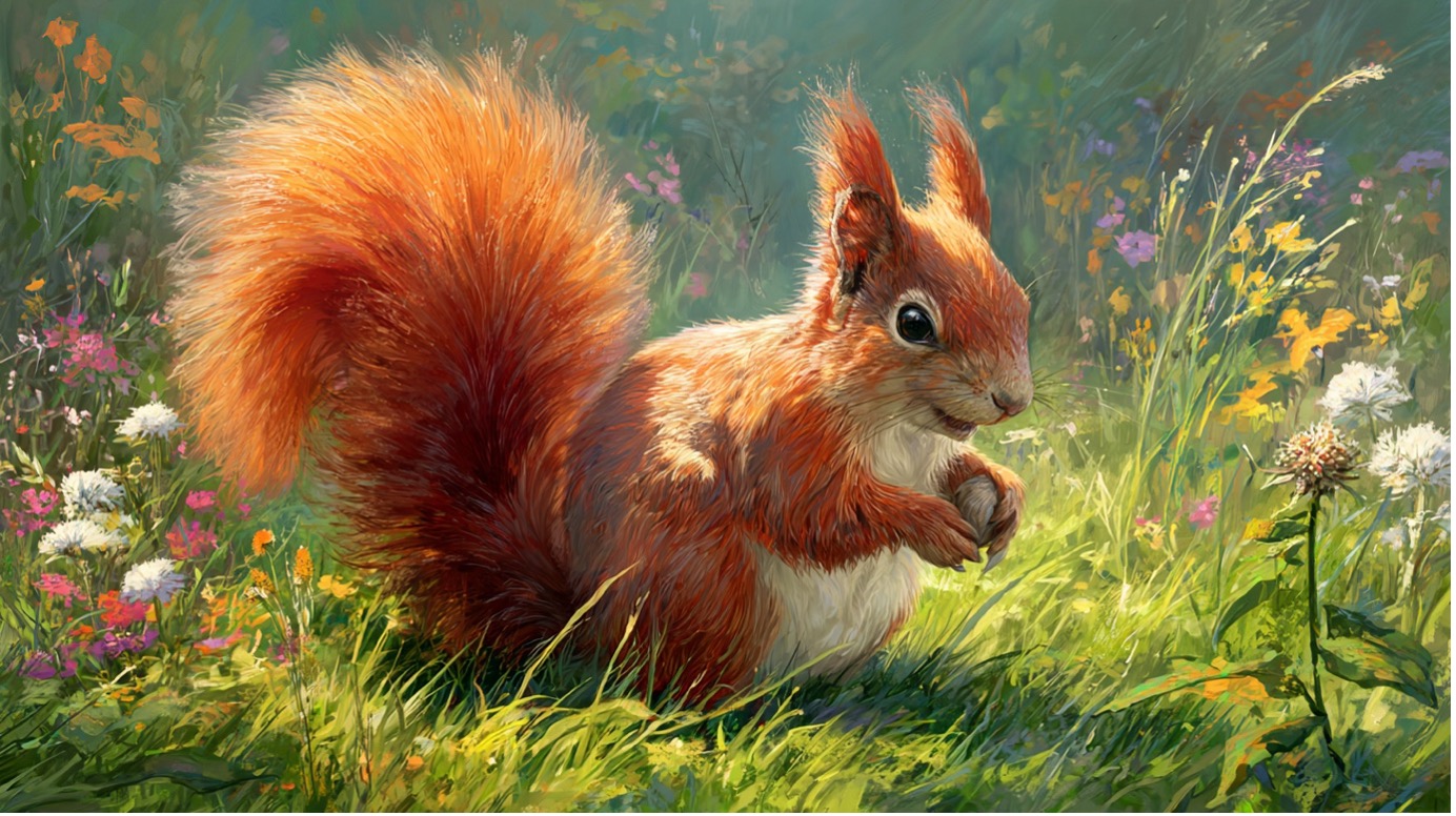 Β«Π ΡΠΆΠ°Ρ ΠΏΡΡΠΈΡΡΠ°Ρ Π±Π΅Π»ΠΊΠ° Ρ ΠΏΡΡΠ½ΡΠΌ Ρ Π²ΠΎΡΡΠΎΠΌ ΡΠΈΠ΄ΠΈΡ Π½Π° Π·Π΅Π»ΡΠ½ΠΎΠΉ Π»ΡΠΆΠ°ΠΉΠΊΠ΅ ΡΡΠ΅Π΄ΠΈ ΠΏΠΎΠ»Π΅Π²ΡΡ ΡΠ²Π΅ΡΠΎΠ², ΠΌΡΠ³ΠΊΠΈΠΉ ΡΡΠΏΠ»ΡΠΉ ΡΠΎΠ»Π½Π΅ΡΠ½ΡΠΉ ΡΠ²Π΅Ρ, Π»ΡΠ³ΠΊΠΈΠΉ Π²Π΅ΡΠ΅Ρ ΠΊΠΎΠ»ΡΡΠ΅Ρ ΡΡΠ°Π²Ρ, ΡΠ΅Π°Π»ΠΈΡΡΠΈΡΠ½ΡΠΉ ΡΡΠΈΠ»Ρ, Π²ΡΡΠΎΠΊΠ°Ρ Π΄Π΅ΡΠ°Π»ΠΈΠ·Π°ΡΠΈΡΒ».