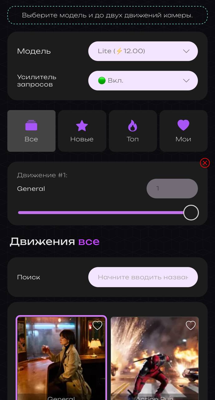 2. Нажмите кнопку “Сгенерировать” без ввода текстового запроса. В этом случае система будет ориентироваться на выбранное движение.
