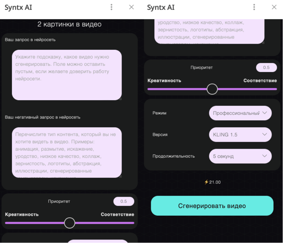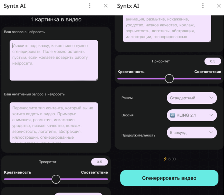 При работе в любом режиме и версии у вас есть возможность выбрать продолжительность генерации: 5 или 10 секунд.
