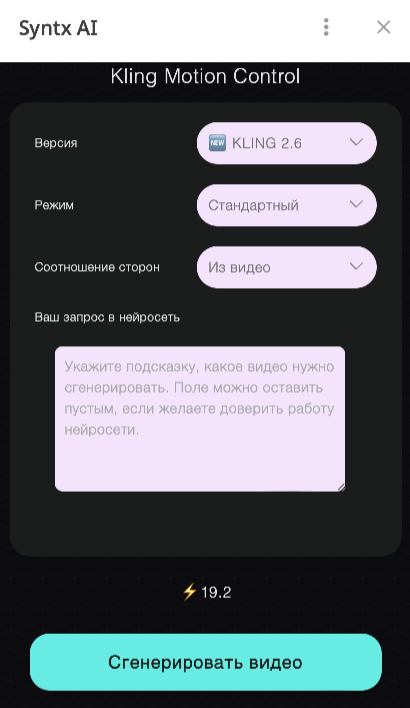 Функция Motion Control доступна только в версии Kling 2.6. Она фиксировано выбрана в настройках.