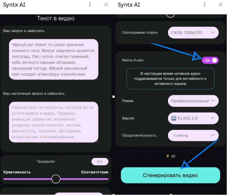 Генерация с озвучкой доступна только при использовании модели Kling 2.6 в профессиональном режиме.