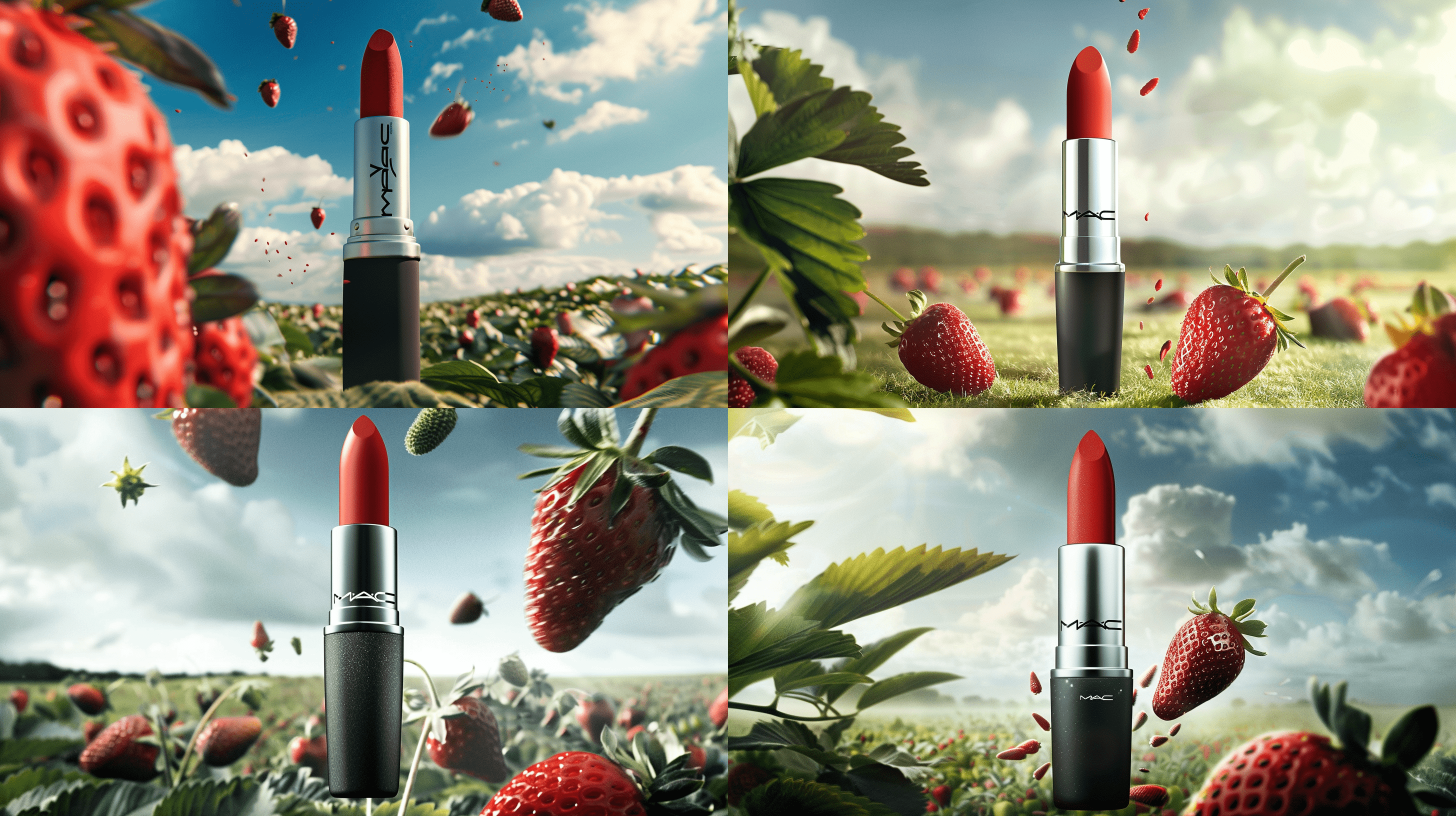 cosmetics falling from the sky, a huge tube of red lipstick, a large strawberry falling nearby in the air, in a large strawberry field, beautiful white text “mac” on the lipstick —cref ссылка из Хранителя Изображений