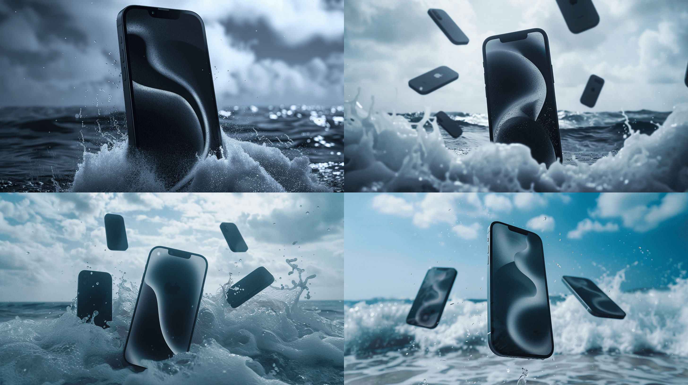 iphone 15 pro by apple fall from the sky, a huge iphone 15, 20 apple devices falling nearby in the air, at the ocean with big waves —cref Ссылка из Хранителя Изображений