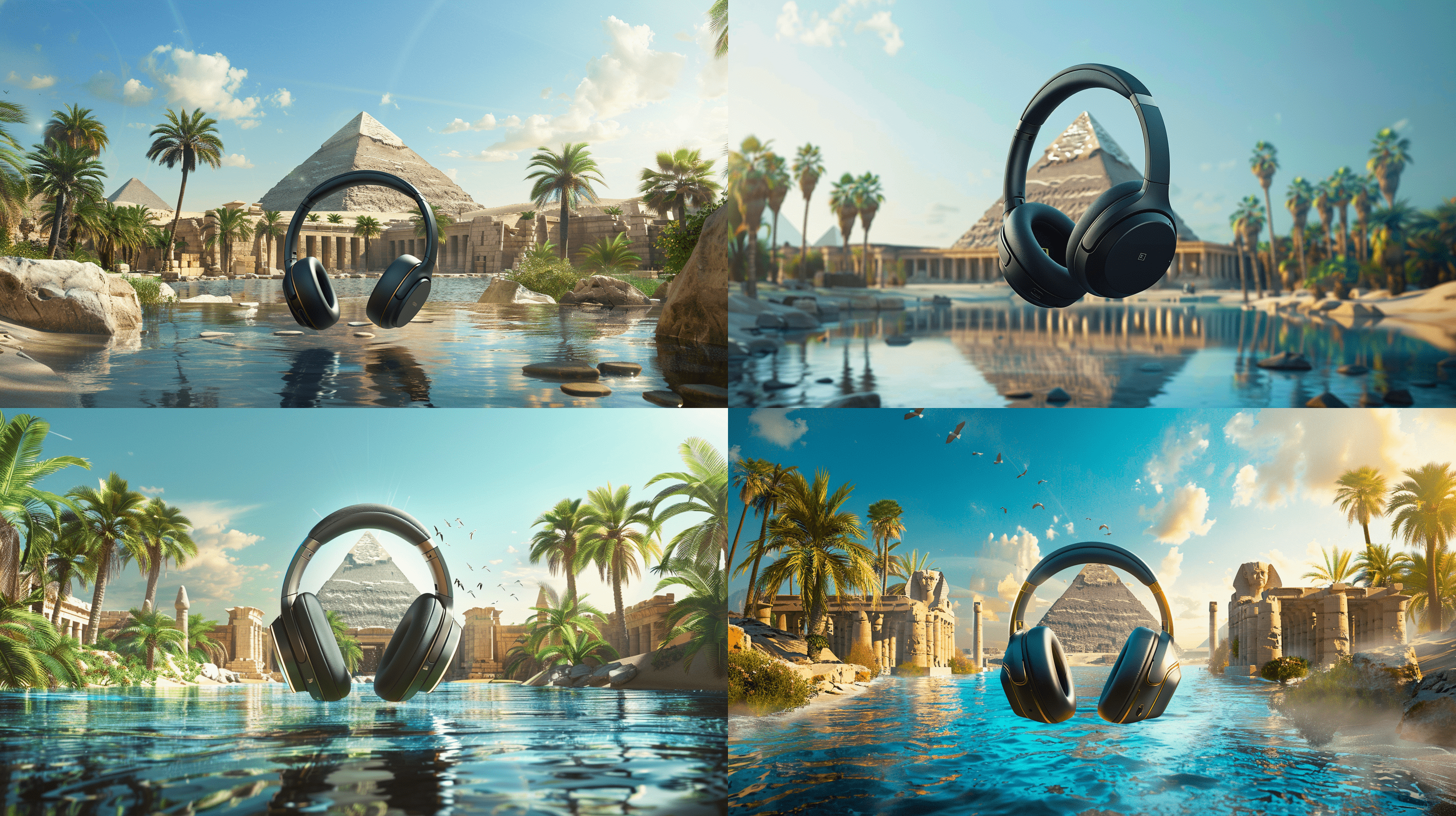 Huge Sony WH-1000XM4 headphones falling from the sky against the backdrop of the scene of the ancient Egyptian kingdom with pyramids and temples against the background of lush palm trees and crystal clear water. The headphones are centered and close to the camera. The pyramid rises against the background of a clear blue sky, and spacious palace rooms are located to the side of it. An ultra-realistic shot taken in the style of high-resolution digital photography using a Sony Alpha A7R IV camera in natural light. —style raw —cref Ссылка из Хранителя Изображений —ar 16:9